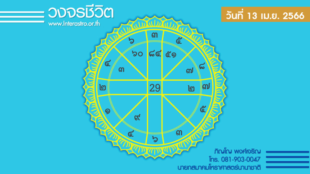 สุริยคติกาล วันที่ 13 เมษายน พ.ศ. 2566 ค.ศ. 2023 จันทรคติกาล ตรงกับวันพฤหัสบดี แรม 8 ค่ำ เดือน 5 ปีขาล จัตวาศก จุลศักราช 1384 อาทิตย์อุทัย เวลา 06.07 น. เที่ยงจริง เวลา 12.19 น. อาทิตย์ตก เวลา 18.31 น. จันทร์ขึ้น เวลา 00.31 น.