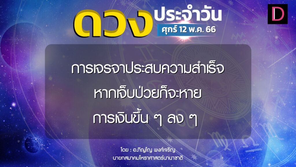 วันนี้ เวลา 00.00-13.54 น. ดาวจันทร์เสวยศรวณนักษัตรฤกษ์ที่ 22 ประกอบด้วยภูมิปาโลแห่งฤกษ์ ภูมิปาโล แปลว่า ผู้รักษาแผ่นดิน เวลา 13.55-24.00 น. ดาวจันทร์เสวยธนิษฐนักษัตรฤกษ์ที่ 23 ประกอบด้วยเทศาตรีแห่งฤกษ์หรือเวสิโยแห่งฤกษ์ เทศาตรี แปลว่า ข้ามถิ่น หมายถึงฤกษ์พ่อค้าข้ามถิ่น วันศุกร์-อุบาทว์และโลกาวินาศตามกาลโยค เวลา 00.00-24.00 น.-ห้ามทำการมงคล ทิศที่เป็นมงคล-ตะวันออกเฉียงใต้ ทิศอัปมงคล-ตะวันตกเฉียงเหนือ สีประจำวัน-ฟ้า น้ำเงิน สีสิริมงคล-ชมพู สีอัปมงคล-ม่วง ดอกตะแบก ดำ ราศีที่ดาวศรีสถิต-กรกฎ ราศีที่ดาวกาลีสถิต-เมษ