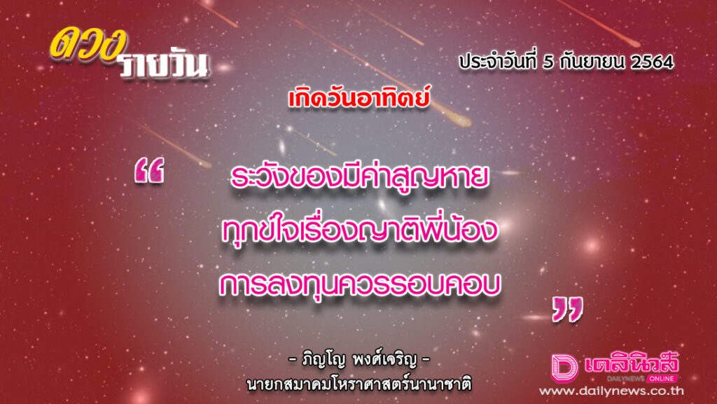 วันนี้ เวลา 00.00-16.42 น. ดาวจันทร์เสวยอาศเลษานักษัตรฤกษ์ที่ 9 ประกอบด้วยสมโณแห่งฤกษ์ สมโณ แปลว่า ผู้สงบ หมายถึง นักบวช พระสงฆ์ สมณชีพราหมณ์ นักสอนศาสนา ครูบาอาจารย์ ผู้ถือสันโดษ เวลา 16.43-24.00 น. ดาวจันทร์เสวยมาฆะนักษัตรฤกษ์ที่ 10 ประกอบด้วยทลิทโทแห่งฤกษ์ ทลิทโท แปลว่า ผู้ขอ ผู้มักน้อย ยากจนเข็ญใจ วันอาทิตย์-ธงไชยตามกาลโยค เวลา 00.00-16.42 น.-ทำการมงคลได้ตามฤกษ์บนหมวดสมโณฤกษ์ เวลา 16.43-24.00 น.-ทำการมงคลได้ตามฤกษ์บนหมวดทลิทโทฤกษ์ ทิศที่เป็นมงคล-ทิศทักษิณ ทิศอัปมงคล-ทิศอุดร (เหนือ) สีประจำวัน-สีแดง สีสิริมงคล-สีเขียวสด สีอัปมงคล-สีฟ้า น้ำเงิน ราศีที่ดาวศรีสถิต-ราศีกันย์ ราศีที่ดาวกาลีสถิต-ราศีกันย์