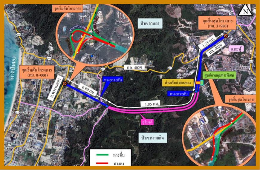 แนวเส้นทางโครงการเริ่มต้นจากถนนตามผังเมืองรวมสาย ก.ในพื้นที่ชุมชนป่าตอง และชุมชนกะรน ต.ป่าตอง มุ่งไปทางทิศตะวันออกบริเวณถนนพระเมตตา สร้างเป็นทางยกระดับข้ามถนนพิศิษฐ์กรณีย์ถึงเขานาคเกิด ระยะทาง 0.9 กม.จากนั้นจะสร้างเป็นอุโมงค์ระยะทาง 1.85 กม. ลอดใต้เทือกเขานาคเกิด และทางยกระดับ ระยะทาง 1.23 กม.ไปยัง ต.กะทู้ผ่านด่านเก็บค่าผ่านทาง จนบรรจบกับทางหลวงแผ่นดินหมายเลข 4029 (ถนนพระบารมี) บริเวณจุดเริ่มต้นและสิ้นสุดโครงการ จะก่อสร้างเป็นทางแยกต่างระดับ พร้อมติดตั้งระบบเก็บเงินค่าผ่านทาง