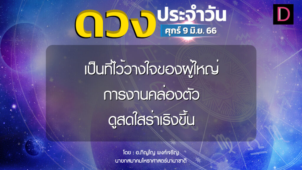 วันนี้ เวลา 00.00-21.06 น. ดาวจันทร์เสวยธนิษฐนักษัตรฤกษ์ที่ 23 ประกอบด้วยเทศาตรีแห่งฤกษ์หรือเวสิโยแห่งฤกษ์ เทศาตรี แปลว่า ข้ามถิ่น หมายถึงฤกษ์พ่อค้าข้ามถิ่น เวลา 21.07-24.00 น. ดาวจันทร์ (2) เสวยศตภิสัชนักษัตรฤกษ์ที่ 24 ประกอบด้วย เทวีแห่งฤกษ์ เทวี แปลว่า นางพญา หมายถึง สตรีผู้มีฐานะและตำแหน่งสูง วันศุกร์-อุบาทว์และโลกาวินาศตามกาลโยค เวลา 00.00-24.00 น. -ห้ามทำการมงคล ทิศที่เป็นมงคล-ตะวันออกเฉียงใต้ ทิศอัปมงคล-ตะวันตกเฉียงเหนือ สีประจำวัน-ฟ้า น้ำเงิน สีสิริมงคล-ชมพู สีอัปมงคล-ม่วงดอกตะแบก ดำ ราศีที่ดาวศรีสถิต-กรกฎ ราศีที่ดาวกาลีสถิต-เมษ