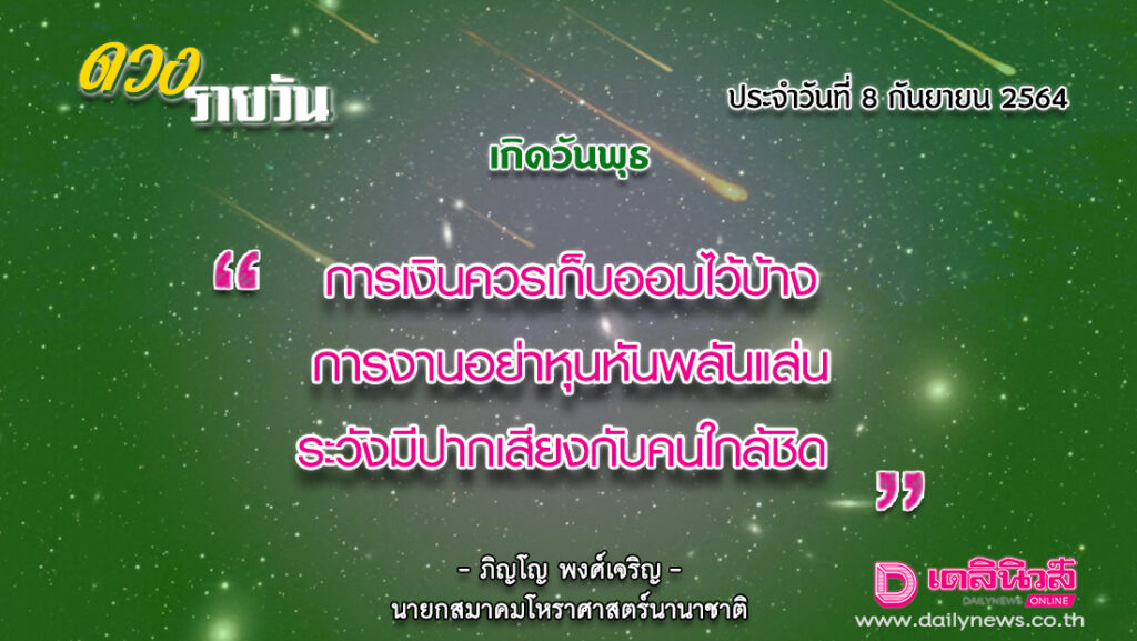 วันนี้ เวลา 00.00-17.06 น. ดาวจันทร์เสวยอุตรผลคุณีนักษัตรฤกษ์ที่ 12 ประกอบด้วยโจโรแห่งฤกษ์ โจโร แปลว่า โจร ผู้ปล้น ผู้ลักขโมย เวลา 17.07-24.00 น. ดาวจันทร์เสวยหัตถนักษัตรฤกษ์ที่ 13 ประกอบด้วย ภูมิปาโลแห่งฤกษ์ ภูมิปาโล แปลว่า ผู้รักษาแผ่นดิน วันพุธ-โลกาวินาศตามกาลโยค เวลา 00.00-24.00 น.-ห้ามทำการมงคล ทิศที่เป็นมงคล-ทิศพายัพ (ตะวันตกเฉียงเหนือ) ทิศอัปมงคล-ทิศอาคเนย์ (ตะวันออกเฉียงใต้) สีประจำวัน-สีเขียว สีสิริมงคล-สีม่วง ดอกตะแบก สีอัปมงคล-สีชมพู ราศีที่ดาวศรีสถิต-ราศีพฤษภ ราศีที่ดาวกาลีสถิต-ราศีกันย์