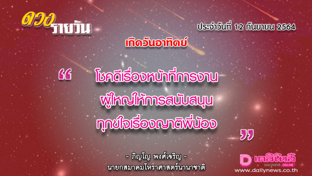 วันนี้ เวลา 00.00-12.18 น. ดาวจันทร์เสวยวิสาขานักษัตรฤกษ์ที่ 16 ประกอบด้วยเพชฌฆาตแห่งฤกษ์ เพชฌฆาต แปลว่า ผู้ฆ่า ทำการเพื่อให้สิ่งที่เข้ามาพ่ายแพ้ ข่มขวัญ น่ายำเกรง มีความขลังและศักดิ์สิทธิ์ เวลา 12.19-24.00 น. ดาวจันทร์เสวยอนุราชนักษัตรฤกษ์ที่ 17 ประกอบด้วยราชาแห่งฤกษ์ ราชา แปลว่า พระเจ้าแผ่นดิน วันอาทิตย์-ธงไชยตามกาลโยค เวลา 00.00-06.07 น.-ห้ามทำการมงคล เวลา 06.08-12.18 น.-ทำการมงคลได้ตามฤกษ์บนหมวดเพชฌฆาตฤกษ์ เวลา 12.19-18.59 น.-ทำการมงคลได้สารพัดตามฤกษ์บนหมวดราชาฤกษ์ เวลา 19.00-24.00 น.-ห้ามทำการมงคล ทิศที่เป็นมงคล-ทิศทักษิณ (ใต้) ทิศอัปมงคล-ทิศอุดร (เหนือ) สีประจำวัน-สีแดง สีสิริมงคล-สีเขียวสด สีอัปมงคล-สีฟ้า น้ำเงิน ราศีที่ดาวศรีสถิต-ราศีกันย์ ราศีที่ดาวกาลีสถิต-ราศีตุล