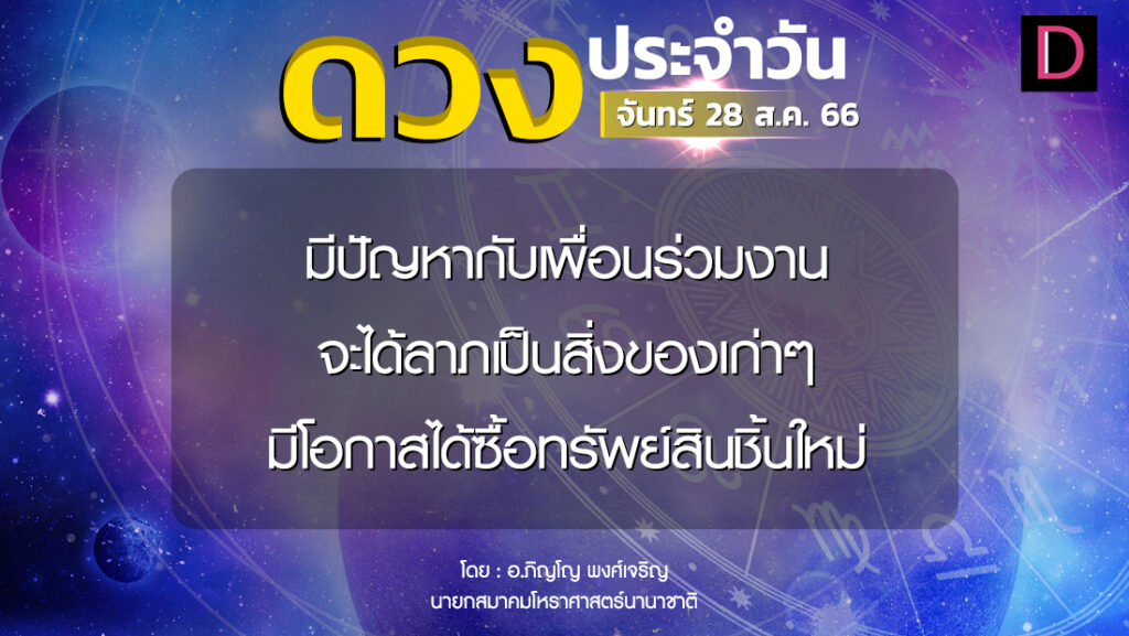วันนี้ เวลา 00.00-00.42 น. ดาวจันทร์เสวยปุพพาษาฒนักษัตรฤกษ์ที่ 20 ประกอบด้วยมหัทธโนแห่งฤกษ์มหัทธโน แปลว่า คหบดี เศรษฐี ผู้มั่งคั่งด้วยทรัพย์สินเงินทอง เวลา 00.43-24.00 น. ดาวจันทร์เสวยอุตราษาฒนักษัตรฤกษ์ที่ 21 ประกอบด้วยโจโรแห่งฤกษ์ โจโร แปลว่า โจร ผู้ปล้น ผู้ลักขโมย เวลา 00.00-24.00 น.-ห้ามทำการมงคล ทิศที่เป็นมงคล-ตะวันตกเฉียงใต้ ทิศอัปมงคล-ตะวันออกเฉียงเหนือ สีประจำวัน-ขาว สีสิริมงคล -ดำ ม่วงแก่ เทา สีอัปมงคล-แดง แดงส้ม ราศีที่ดาวศรีสถิต-กุมภ์ ราศีที่ดาวกาลีสถิต-สิงห์