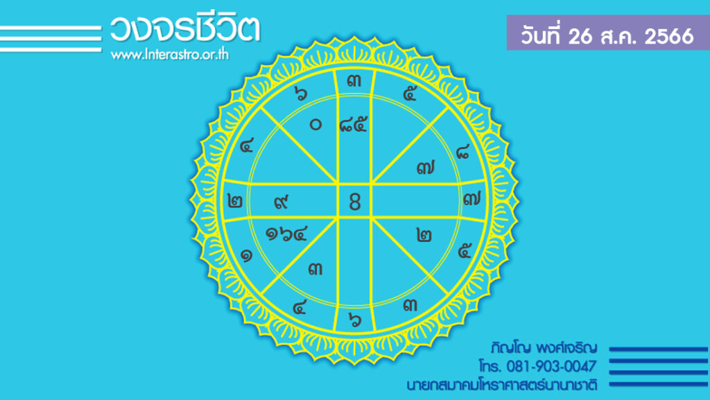 สุริยคติกาล วันที่ 26 สิงหาคม พ.ศ. 2566 ค.ศ. 2023 จันทร คติกาล ตรงกับวันเสาร์ ขึ้น 10 ค่ำ เดือน 9 ปีเถาะ เบญจศก จุลศักราช 1385 อาทิตย์อุทัย เวลา 06.06 น. เที่ยงจริง เวลา 12.20 น. อาทิตย์ตก เวลา 18.35 น. จันทร์ตก เวลา 02.20 น.