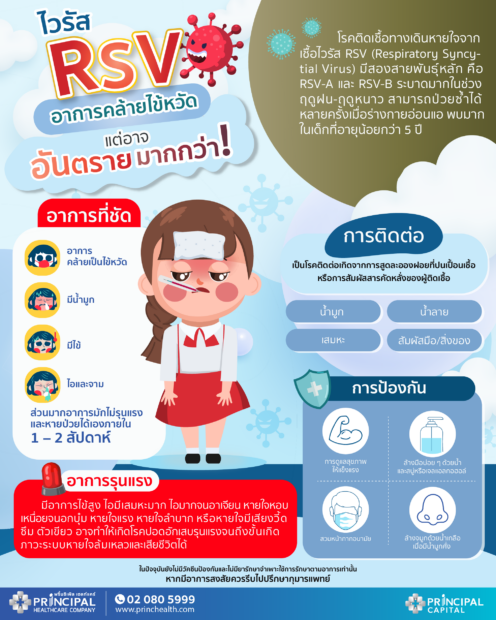 วันนี้ นพ.ณัฏฐ์ชยนต์ รัตนตระกูลเดชา หรือคุณหมอหยก กุมารแพทย์โรคระบบหายใจ ประจำโรงพยาบาลพริ้นซ์ สุวรรณภูมิ ในเครือพริ้นซิเพิล เฮลท์แคร์ (PRINCIPAL HEALTHCARE) ได้เผยผ่าน Healthy Clean ว่าโรคติดเชื้อทางเดินหายใจจากเชื้อไวรัส RSV (Respiratory Syncytial Virus) มีสองสายพันธุ์หลัก คือ RSV-A และ RSV-B สามารถป่วยซ้ำได้หลายครั้งเมื่อร่างกายอ่อนแอ โรคนี้มักพบระบาดมากในช่วงฤดูฝนถึงต้นฤดูหนาว (ประมาณเดือนกรกฎาคม–มกราคม) พบมากในเด็กที่อายุน้อยกว่า 5 ปี