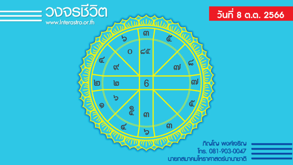 สุริยคติกาล วันที่ 8 ตุลาคม พ.ศ. 2566 ค.ศ. 2023 จันทรคติกาล ตรงกับวันอาทิตย์ แรม 9 ค่ำ เดือน 10 ปีเถาะ เบญจศก จุลศักราช 1385 อาทิตย์อุทัย เวลา 06.08 น. เที่ยงจริง เวลา 12.06 น. อาทิตย์ตก เวลา 18.03 น. จันทร์ขึ้น เวลา 01.46 น.