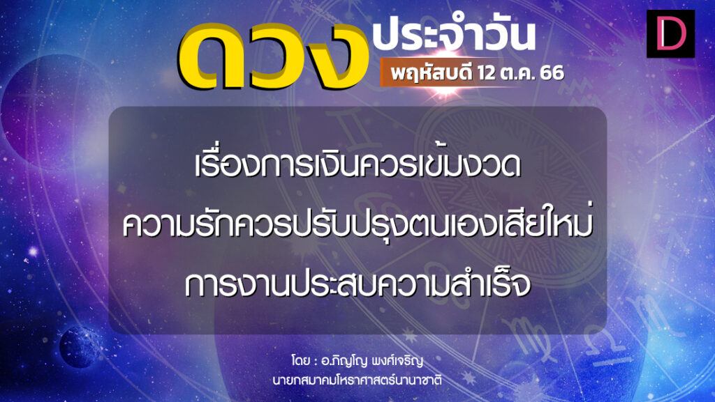 วันนี้ เวลา 00.00-11.06 น. ดาวจันทร์เสวยปุรพผลคุณีนักษัตรฤกษ์ที่ 11 ประกอบด้วย มหัทธโนแห่งฤกษ์ มหัทธโน แปลว่า คหบดี เศรษฐี ผู้มั่งคั่งด้วยทรัพย์สินเงินทอง เวลา 11.07-24.00 น. ดาวจันทร์เสวยอุตรผลคุณีนักษัตรฤกษ์ที่ 12 ประกอบด้วยโจโรแห่งฤกษ์ โจโร แปลว่า โจร ผู้ปล้น ผู้ลักขโมย เวลา 00.00-24.00 น.-ห้ามทำการมงคล ทิศที่เป็นมงคล-ตะวันออกเฉียงเหนือ ทิศอัปมงคล-ตะวันตกเฉียงใต้ สีประจำวัน-เหลือง แสด สีสิริมงคล-แดงส้ม สีอัปมงคล-ดำ ม่วงแก่ เทา ราศีที่ดาวศรีสถิต-กันย์ ราศีที่ดาวกาลีสถิต-กุมภ์