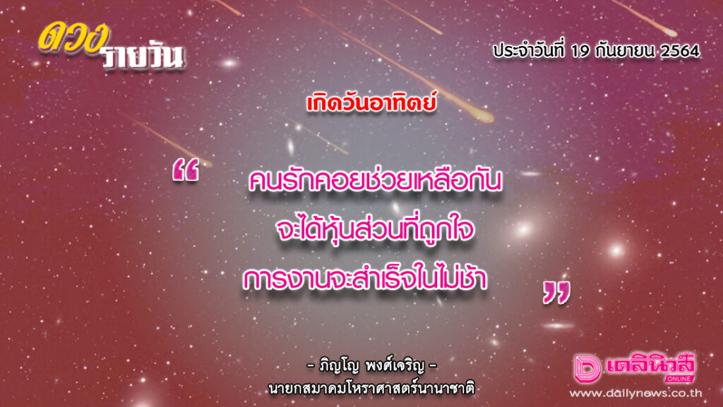 เกิดวันอาทิตย์ คนรักมีโอกาสได้ช่วยเหลือซึ่งกันและกัน ควรลดอาการจู้จี้ ขี้บ่นลงไปบ้างจะทำให้สถานการณ์ดีขึ้น การที่เป็นคนช่างคิด วิตกกังวล หวาดระแวง และจริงจังเข้มงวดจนเกินไป จะทำให้เกิดอาการเคร่งเครียดทางประสาท จะได้เพื่อนหรือหุ้นส่วนที่ถูกใจไว้คอยให้คำปรึกษาหารือ การทำนิติกรรมสัญญาสำคัญเกี่ยวกับการงานจะสำเร็จในไม่ช้า
