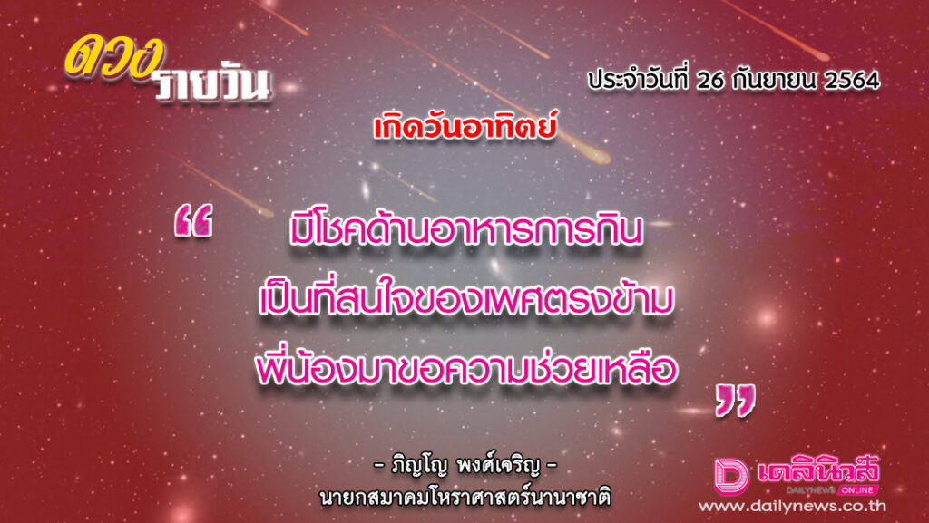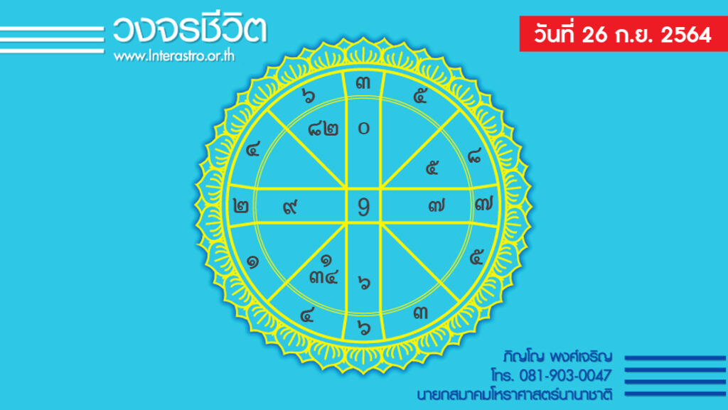 สุริยคติกาล วันที่ 26 กันยายน พ.ศ. 2564 ค.ศ. 2021 จันทรคติกาล ตรงกับวันอาทิตย์ แรม 5 ค่ำ เดือน 10 ปีฉลู ตรีศก จุลศักราช 1383 อาทิตย์อุทัย เวลา 06.07 น. เที่ยงจริง เวลา 12.10 น. อาทิตย์ตก เวลา 18.13 น. จันทร์ขึ้น เวลา 22.36 น.