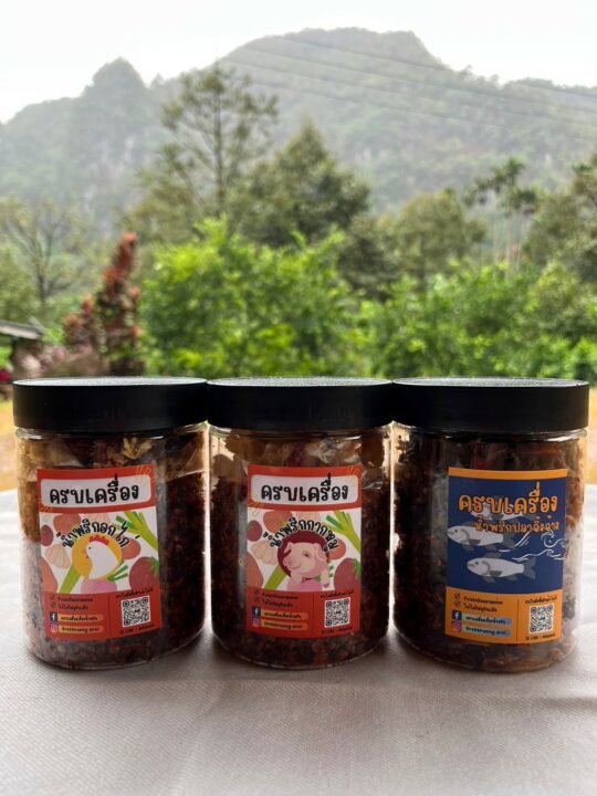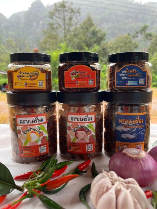 แต่ก่อนจะลองชิมน้ำพริก เราก็ขอพาไปพูดคุยกับ “คุณหนิง-กนกกาญจน์ โคมแก้ว” เจ้าของน้ำพริกครบเครื่อง โดยคุณหนิง ได้เล่าถึงที่มาของการเริ่มต้นทำน้ำพริกแซ่บๆ ว่า จริงๆ แล้ว เคยทำงานเป็น Executive chef food stylist ออกแบบเมนูอาหารให้กับภัตตาคารชื่อดังแห่งหนึ่งในกรุงเทพฯ นานถึง 6 ปี แต่คุณพ่อป่วยเป็นมะเร็งระยะสุดท้าย เลยต้องกลับเพื่อมาดูแลคุณพ่อ และดูแลสวนทุเรียนของครอบครัว ที่ อ.สวี จ.ชุมพร หลังจากคุณพ่อท่านเสีย ประจวบกับทางภัตตาคารต้องหยุดยาวช่วงสถานการณ์โควิด จึงตัดสินใจลาออก จึงมีไอเดียในการการทำผลิตภัณฑ์น้ำพริกสูตรของคุณแม่ ที่เราเคยทานและชื่นชอบมาตั้งแต่เด็ก จึงทดลองทำและพัฒนาสูตรเพื่อให้ได้รสชาติที่พอใจและลงตัวมากที่สุด สำหรับลูกค้าทุกภาคที่อาจทานเผ็ดได้ไม่เหมือนกัน แล้วยังเพิ่มตัวเลือกน้ำพริกให้มีหลากหลายสูตรมากขึ้น