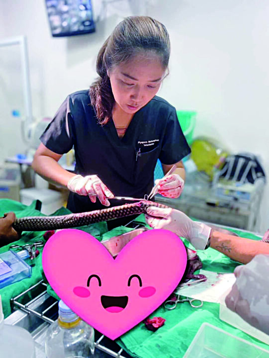 ผู้สื่อข่าวถามว่าทำไมหมอจึงตัดสินใจรับรักษางูจงอางยักษ์ตัวดังกล่าวและมีความรู้สึกอย่างไร สัตวแพทย์หญิงปิยาภรณ์ ตอบว่าหมอรับรักษาทุกเคส แม้จะไม่ได้เป็นหมอเฉพาะทางด้านการรักษางู โดยสัตว์ส่วนใหญ่ที่มาหาหมอบ่อยนอกจากน้องหมาน้องแมวก็มีพวกลิง กระต่าย และพวกสัตว์แปลก ๆ อื่น ๆ ซึ่งคงไม่มีหมอคนไหนในละแวกนี้ที่จะรับรักษางูจงอางอยู่แล้ว แต่หมอมีเพื่อนที่เขาเชี่ยวชาญในเรื่องนี้ จึงปรึกษาและช่วยหมอในส่วนนี้หมอก็คิดว่าหมอช่วยเท่าที่จะช่วยได้ และหมอก็ไม่ได้คิดค่าใช้จ่ายในการรักษางูจงอางตัวนี้จากพี่ ๆ ทหาร พี่ทหารเขาถามว่าจะคิดค่าใช้จ่ายยังไง เท่าไหร่ เพราะเขาจะได้ระดมทุนกันเอง เมื่อทราบเช่นนั้นหมอได้บอกว่าไม่เป็นไรพี่ ๆ ทหารก็เสี่ยงในการจับและดูแลงูจงอางมาแล้ว ในส่วนของค่าใช้จ่ายในการผ่าตัดรักษาทางโรงพยาบาลจะช่วยก็แล้วกัน เพราะงูจงอางเป็นสัตว์ป่าคุ้มครองด้วย หมอก็ช่วยในส่วนนั้น หมออยากช่วยและทำบุญไปด้วย.