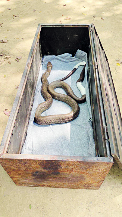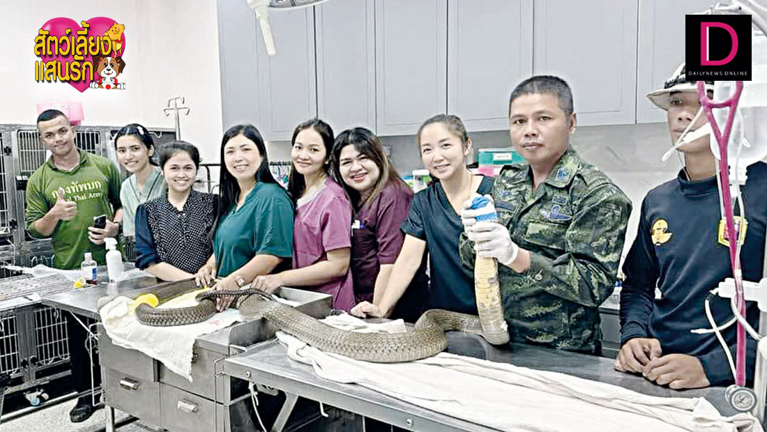 “จริง ๆ หมอไม่ได้เป็นหมอเฉพาะทางด้านการรักษางู หมอจึงโทรฯไปสอบถามเพื่อนที่เชี่ยวชาญด้านงูว่าส่วนอวัยวะที่คิดว่าเป็นลำไส้ที่ทะลักออกมาด้านนอกมันเป็นอะไร เพื่อนหมอบอกว่าไม่ใช่ลำไส้ แต่เป็นส่วนของอวัยวะสืบพันธุ์ของงูจงอาง หมอจึงทำการตรวจเช็กดูว่างูจงอางตัวดังกล่าวเป็นเพศผู้หรือเพศเมีย ปรากฏว่าเป็นเพศผู้ ส่วนที่ทะลักออกมาไม่ใช่ลำไส้แต่เป็นส่วนระบบสืบพันธุ์เพศผู้ของงูจงอาง คล้าย ๆ ถุงอัณฑะของงูที่ไหลทะลักออกมา และเมื่อพิจารณาว่าจะต้องทำอย่างไรต่อไป เนื่องจากเป็นแผลโดนสุนัขกัดซ้ำมาก ๆ และผ่านมาหลายวันเริ่มจะเน่าแล้วรวมทั้งส่วนหางของงูจงอางด้วย โดยมี 2 แนวทางที่ต้องตัดสินใจ คือเราจะตัดหางงูจงอางทิ้งไปเลยไหม และจะเก็บเอาส่วนหางไว้ไปก่อน ในที่สุดก็ตัดสินใจมาตัดอวัยวะสืบพันธุ์ที่เน่าบางส่วนทิ้งและยัดกลับเข้าไปก่อนเย็บแผล ใส่ยาฆ่าเชื้อเพื่อสังเกตว่าในส่วนหางที่ช้ำจะเน่าไหม หลังจากเย็บแผลและรอดูอาการ 3 วันก็พบว่าแผลที่เย็บก็ดีขึ้น แต่รอยช้ำที่หางมันช้ำเยอะก็ต้องรอดูว่ามันจะอักเสบมากไหม โดยทหารได้รับงูจงอางกลับไป โดยหมอได้จัดยาฉีดเป็นยาฆ่าเชื้อและรักษาอาการอักเสบให้ทหารไปฉีดเอง โดยต้องฉีดยาต่อเนื่อง 7-10 วันและจะตัดไหมในระหว่าง 14-18 วัน