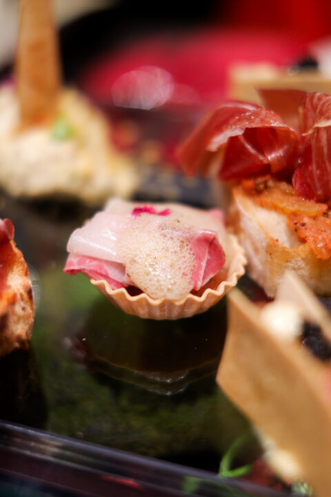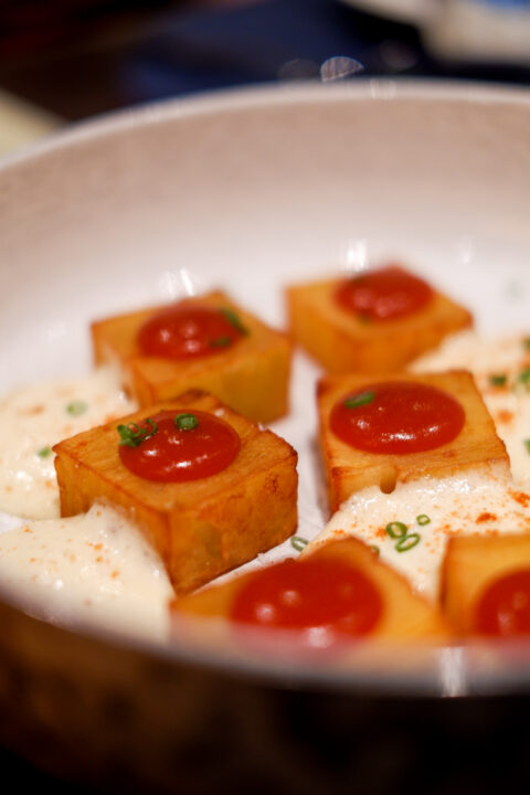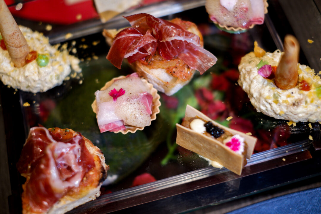 เอาล่ะค่ะ เราคงไม่ต้องเล่าอะไรกันต่อแล้ว มาเริ่มชิมมื้อนี้กันดีกว่า ด้วยอาหารเรียกนำย่อยอย่าง “ปลาไอเบริก” (Iberic Fish) เป็นการนำปลาจากคาบสมุทธไอบีเรีย ผสมผสานเข้ากันกับปลาฮามาจิ เมนไทโกะ มะเขือเทศทาร์ทาร์ ขนมปังปิ้ง และวาซาบิโฟม “เดอะสเต็กทาร์ทาร์” (The Steak Tartare) เสิร์ฟบนแมร์โรวโบน มาพร้อมกับมายองเนสสูตรพิเศษและเบรีคาเวียร์