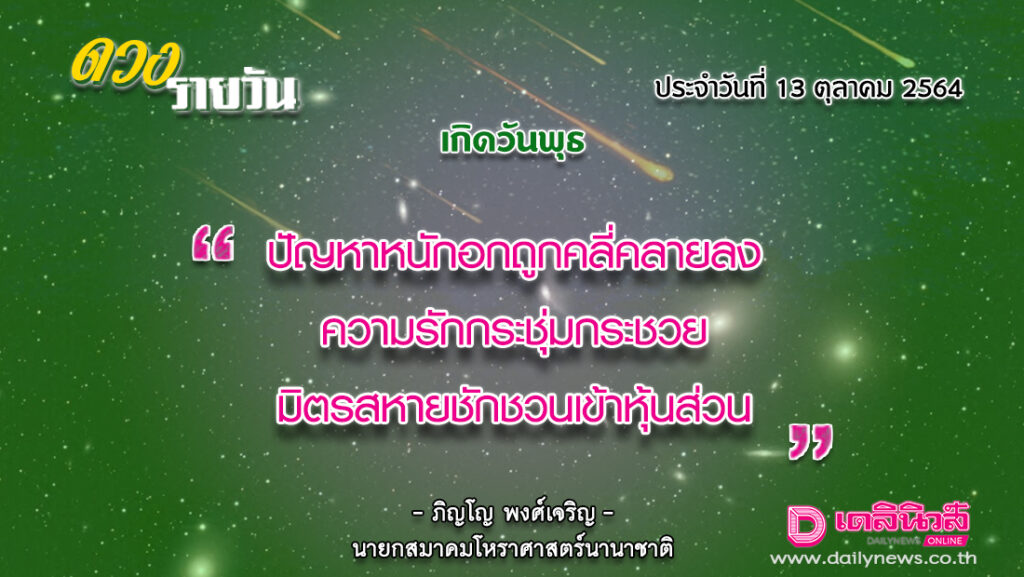 วันนี้ เวลา 00.00-14.18 น. ดาวจันทร์เสวยปุพพาษาฒนักษัตรฤกษ์ที่ 20 ประกอบด้วย มหัทธโนแห่งฤกษ์ มหัทธโน แปลว่า คหบดี เศรษฐี ผู้มั่งคั่งด้วยทรัพย์สินเงินทอง เวลา 18.19-24.00 น. ดาวจันทร์เสวยอุตราษาฒนักษัตรฤกษ์ที่ 21 ประกอบด้วยโจโรแห่งฤกษ์ โจโร แปลว่า โจร ผู้ปล้น ผู้ลักขโมย เป็นฤกษ์ที่ให้ความหมายในการใช้กำลังหรือใช้อำนาจเข้าทำการบังคับ ช่วงชิงกรรมสิทธิ์ของคนอื่นโดยพลการ วันพุธ-โลกาวินาศตามกาลโยค เวลา 00.00-24.00 น.-ห้ามทำการมงคล ทิศที่เป็นมงคล-ทิศพายัพ(ตะวันตกเฉียงเหนือ) ทิศอัปมงคล-ทิศอาค เนย์(ตะวันออกเฉียงใต้) สีประจำวัน-สีเขียว สีสิริมงคล-สีม่วง ดอกตะแบก สีอัปมงคล-สีชมพู ราศีที่ดาวศรีสถิต-ราศีพฤษภ ราศีที่ดาวกาลีสถิต-ราศีกันย์