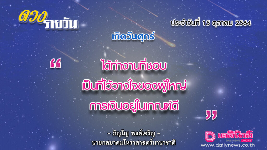 เกิดวันศุกร์ ผู้ใหญ่และเพื่อนร่วมงานให้การสนับสนุน ท่านสามารถทำงานร่วมกับผู้อื่นได้ดี มีโอกาสได้ใช้ความรู้ความสามารถ จะได้ทำงานที่ชอบและเหมาะสมกับวุฒิภาวะ จะมีงานใหม่ ๆ เข้ามาให้ทำ การงานที่ทำอยู่จะมีการปรับปรุงเปลี่ยนแปลงให้ดีขึ้น ท่านต้องใช้ความรู้ความสามารถมากขึ้น เป็นที่ไว้วางใจของผู้ใหญ่และเพื่อนร่วมงาน มีความพึงพอใจในผลงานของตน