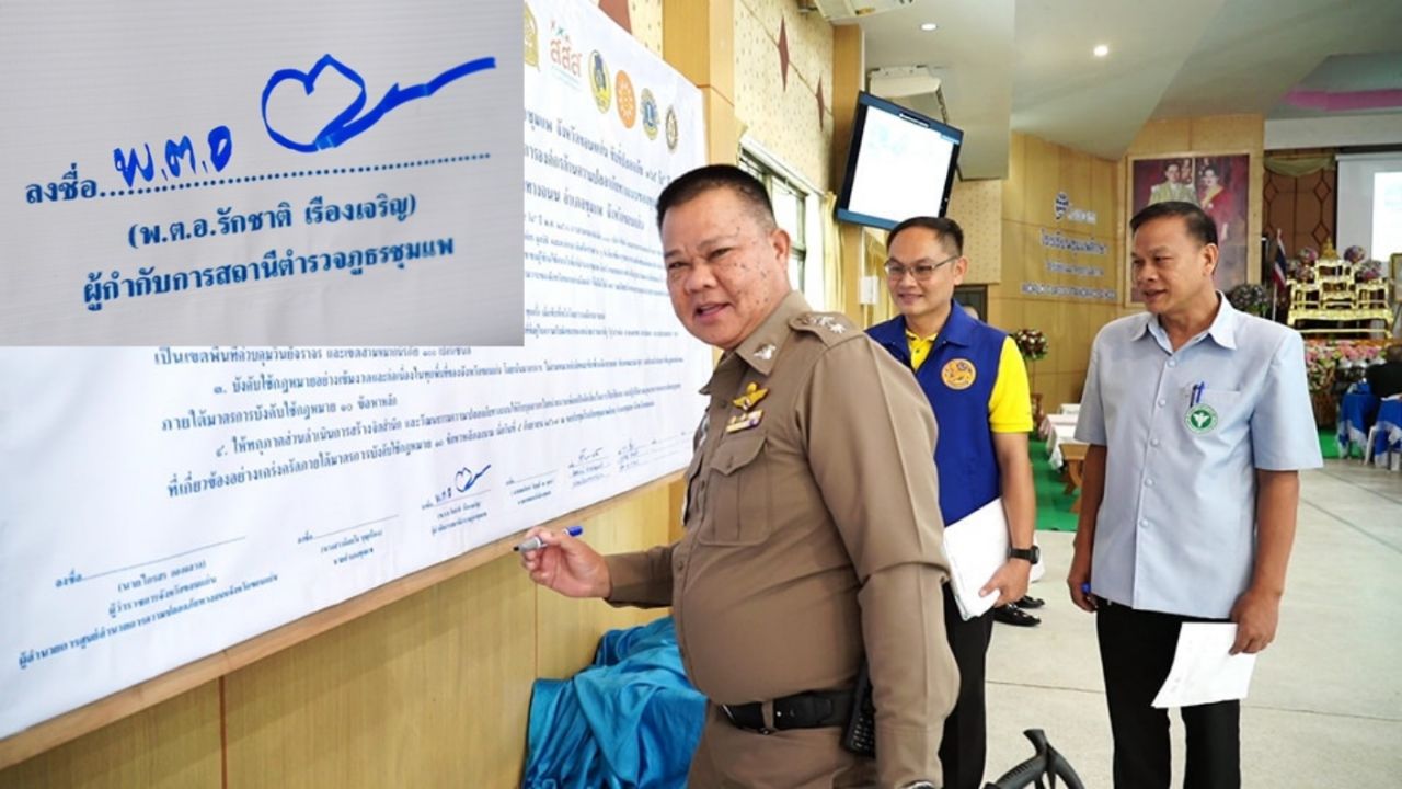 พ.ต.อ.รักชาติ เรืองเจริญ ผกก.สภ.ชุมแพ จว.ขอนแก่น แจกลายเซ็นหัวใจดวงน้อย ในพิธีลงนามความร่วมมือการขับเคลื่อนวาระอำเภอชุมแพ ขับขี่ปลอดภัย 365 วัน ก่อนจะงัดมาตรการบังคับใช้กฎหมาย 10 ข้อหาหนัก อย่างเข้มงวดและต่อเนื่อง เพื่อสร้างวัฒนธรรมความปลอดภัยทางถนนให้กับประชาชน พร้อมฝากถึงประชาชน ช่วยกันปฏิบัติตามกฎหมาย เพื่อความปลอดภัย “เพราะรักตำรวจถึงจับ”