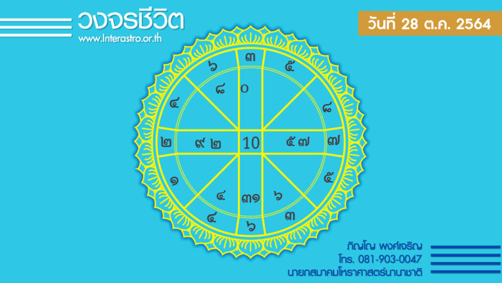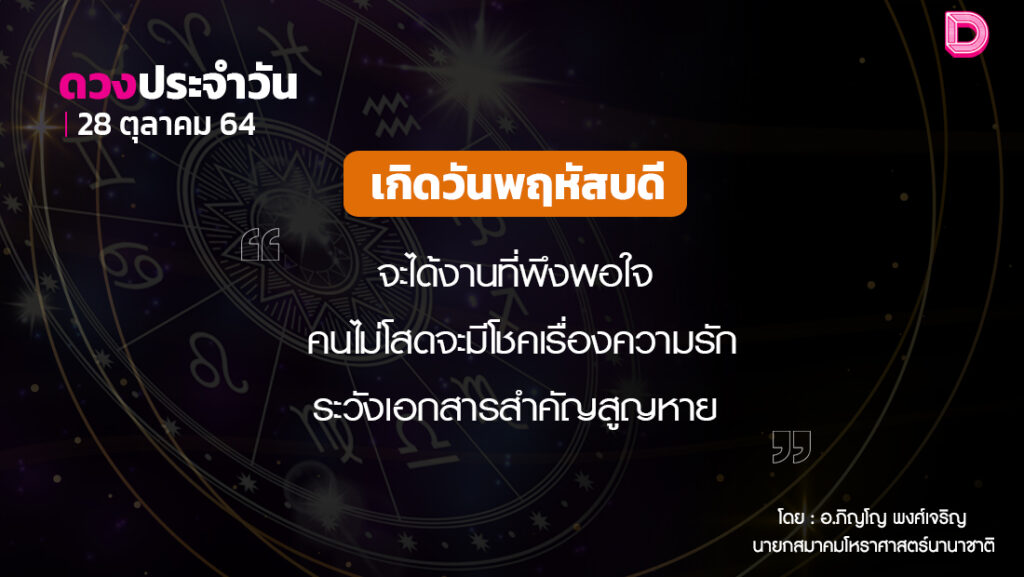 วันนี้ เวลา 00.00-05.30 น. ดาวจันทร์เสวยปุนนัพสุนักษัตรฤกษ์ที่ 7 ประกอบด้วยเพชฌฆาตแห่งฤกษ์ เพชฌฆาต แปลว่า ผู้ฆ่า ทำการเพื่อให้สิ่งที่เข้ามาพ่ายแพ้ เวลา 05.31-24.00 น. ดาวจันทร์เสวยปุษยะนักษัตรฤกษ์ที่ 8 ประกอบด้วยราชาแห่งฤกษ์ ราชา แปลว่า พระเจ้าแผ่นดิน เวลา 00.00-24.00 น.-ห้ามทำการมงคล ทิศที่เป็นมงคล-ทิศอีสาน (ตะวันออกเฉียงเหนือ) ทิศอัปมงคล-ทิศหรดี (ตะวันตกเฉียงใต้) สีประจำวัน-สีเหลือง แสด สีสิริมงคล-สีแดงส้ม สีอัปมงคล-สีดำ ม่วงแก่ ราศีที่ดาวศรีสถิต-ราศีตุล ราศีที่ดาวกาลีสถิต-ราศีมังกร