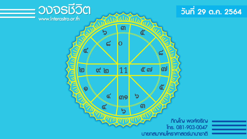 วันนี้ เวลา 00.00-07.06 น. ดาวจันทร์เสวยปุษยะนักษัตรฤกษ์ที่ 8 ประกอบด้วยราชาแห่งฤกษ์ ราชา แปลว่า พระเจ้าแผ่นดิน เวลา 07.07-24.00 น. ดาวจันทร์เสวยอาศเลษานักษัตรฤกษ์ที่ 9 ประกอบด้วยสมโณแห่งฤกษ์ สมโณ แปลว่า ผู้สงบ หมายถึง นักบวช พระสงฆ์ สมณชีพราหมณ์ นักสอนศาสนา ครูบาอาจารย์ ผู้ถือสันโดษ เวลา 00.00-24.00 น.-ห้ามทำการมงคล ทิศที่เป็นมงคล-ทิศอาคเนย์ (ตะวันออกเฉียงใต้) ทิศอัปมงคล-ทิศพายัพ (ตะวันตกเฉียงเหนือ) สีประจำวัน-สีฟ้า น้ำเงิน สีสิริมงคล-สีชมพู สีอัปมงคล-สีม่วงดอกตะแบก ดำ ราศีที่ดาวศรีสถิต-ราศีตุลย์ ราศีที่ดาวกาลีสถิต-ราศีพฤษภ