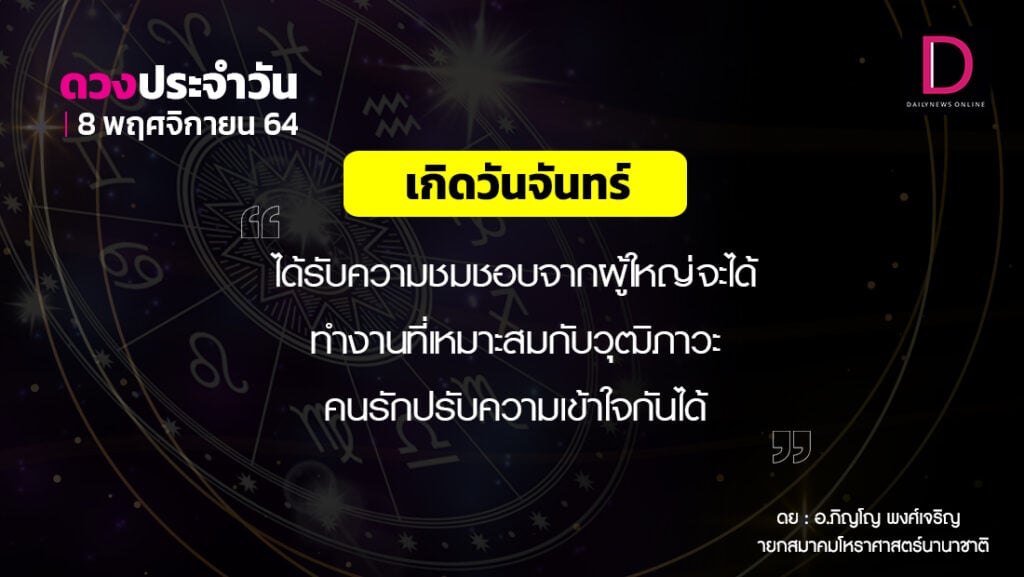 เกิดวันจันทร์ มีโอกาสได้ศึกษาอบรมเพิ่มเติม จะได้รับความนิยมชมชอบจากผู้ใหญ่และเพื่อนร่วมงาน ท่านสามารถทำงานร่วมกับผู้อื่นได้ดี ควรปรับปรุงการงานเดิมให้ดีขึ้นดีกว่านำเงินไปลงทุนในธุรกิจใหม่ที่ไม่แน่นอน จะได้ทำงานที่เหมาะสมกับวุฒิภาวะ จะมีเรื่องวุ่นวายเรื่องรัก ๆ ใคร่ ๆ จะมีการรับประทานอาหารที่แปลก ๆ คนรักปรับความเข้าใจกันได้