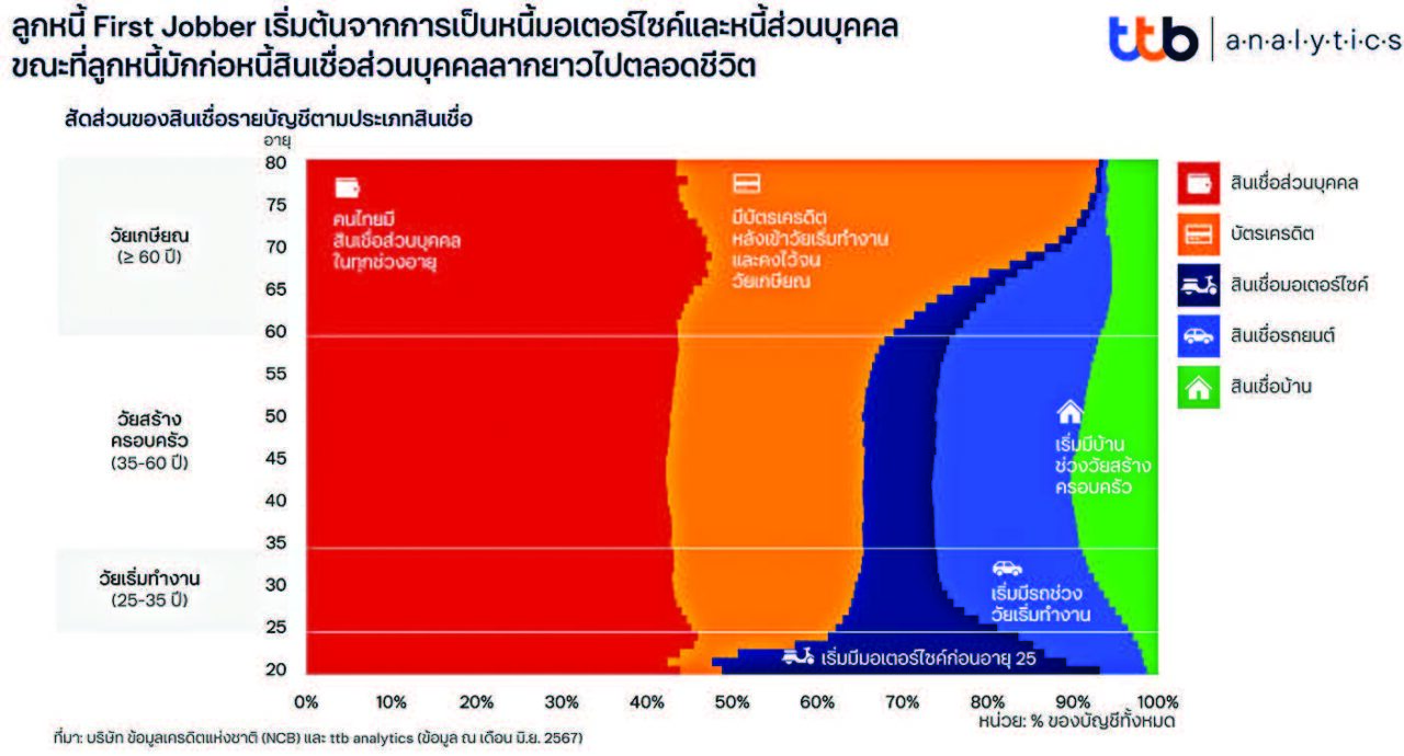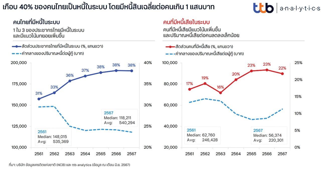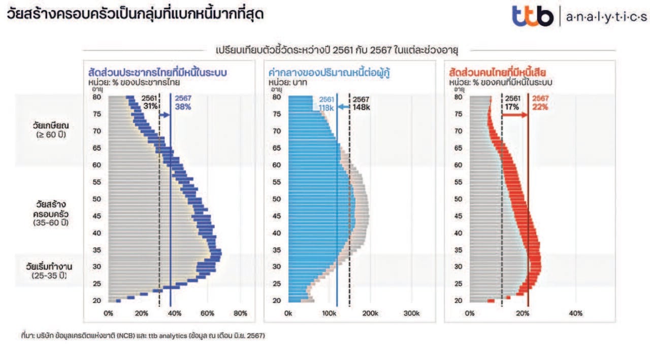 ข้อมูลหนี้ครัวเรือนไทยจาก ธปท. ไตรมาส 4 ปี 67 พบว่าหนี้ครัวเรือนอยู่ระดับสูง 16.42 ล้านล้านบาท คิดเป็นส่วน 88.4% ต่อจีดีพียิ่งไปกว่านั้นคนไทยมีหนี้เร็วโดยพบว่าคนที่เพิ่งเริ่มทำงานอายุ 20-35 ปี มีหนี้และสัดส่วนไม่ลดลงซึ่งกลุ่มที่เพิ่งเริ่มทำงานนี้เองได้สร้างหนี้บัตรเครดิตหนี้ส่วนบุคคล หนี้รถ สูงที่สุดและยังพบว่ามีหนี้เสียสูงเป็นอันดับต้น ๆ เมื่อเทียบกับวัยอื่น ๆ เพราะรายได้ยังไม่มากพอต่อรายจ่ายทำให้เกิดปัญหามีหนี้เกินตัว