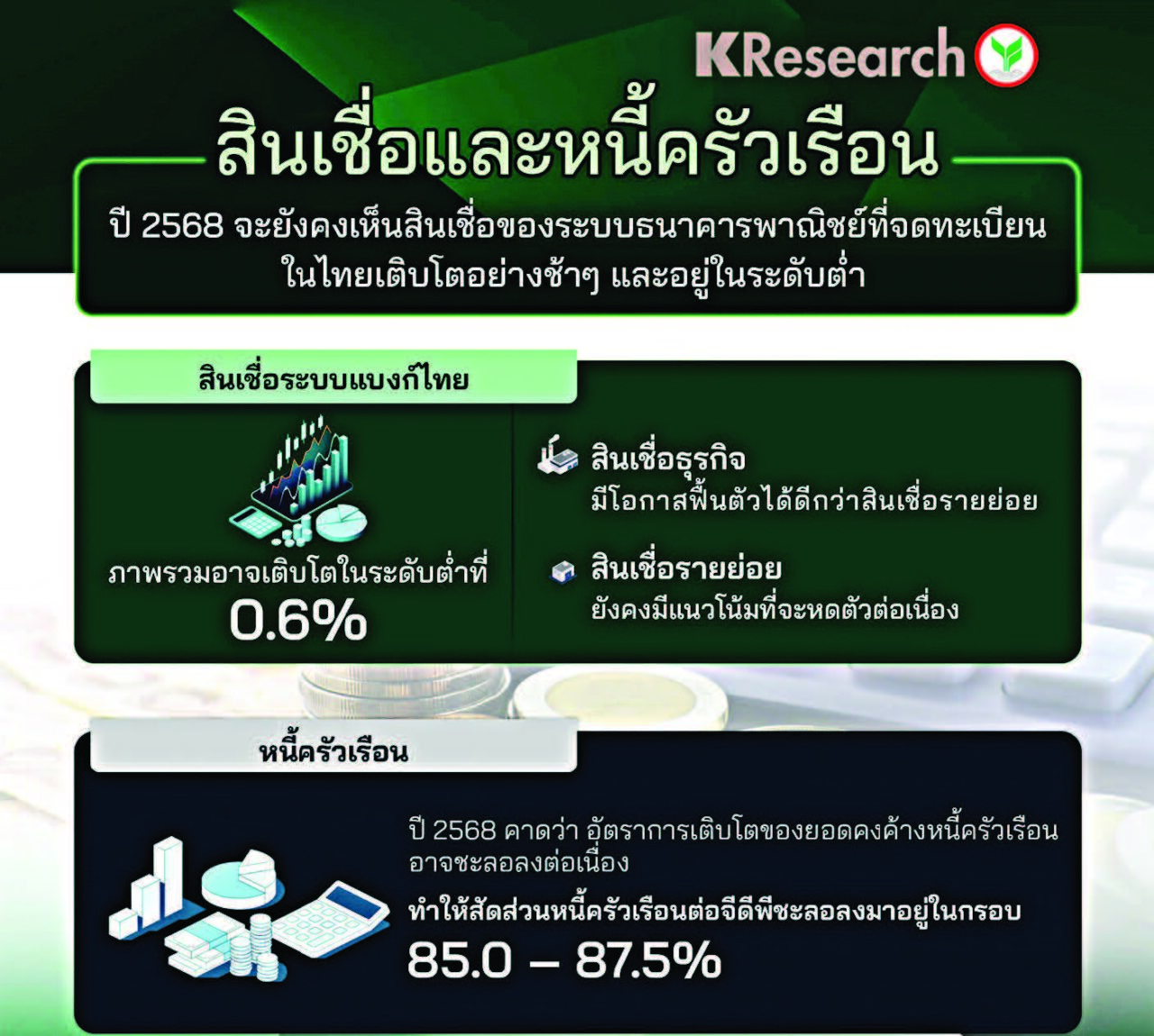 “ศูนย์วิจัยกสิกรไทย” ประเมินสินเชื่อรายย่อยในระบบแบงก์ไทยมีแนวโน้มที่จะหดตัวต่อเนื่องในปี 68 โดยอาจหดตัวลง 1% ต่อเนื่องจากปีที่ผ่านมาจากการฟื้นตัวที่จำกัดของรายได้ในภาคครัวเรือนและภาระหนี้สินที่มีอยู่เดิมมีผลกระทบต่อความสามารถในการก่อหนี้ก้อนใหม่โดยเฉพาะหนี้ที่มีวงเงินต่อสัญญาที่ค่อนข้างสูงเช่น หนี้บ้าน และหนี้รถยนต์