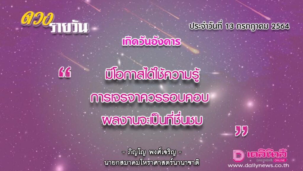 สุริยคติกาล วันที่ 13 กรกฎาคม พ.ศ. 2564 ค.ศ. 2021จันทรคติกาล ตรงกับวันอังคาร ขึ้น 4 ค่ำ เดือน 8/8 ปีฉลู ตรีศก จุลศักราช 1383อาทิตย์อุทัย เวลา 05.57 น. เที่ยงจริง เวลา 12.24 น. อาทิตย์ตก เวลา 18.50 น. จันทร์ตก เวลา 21.08 น.