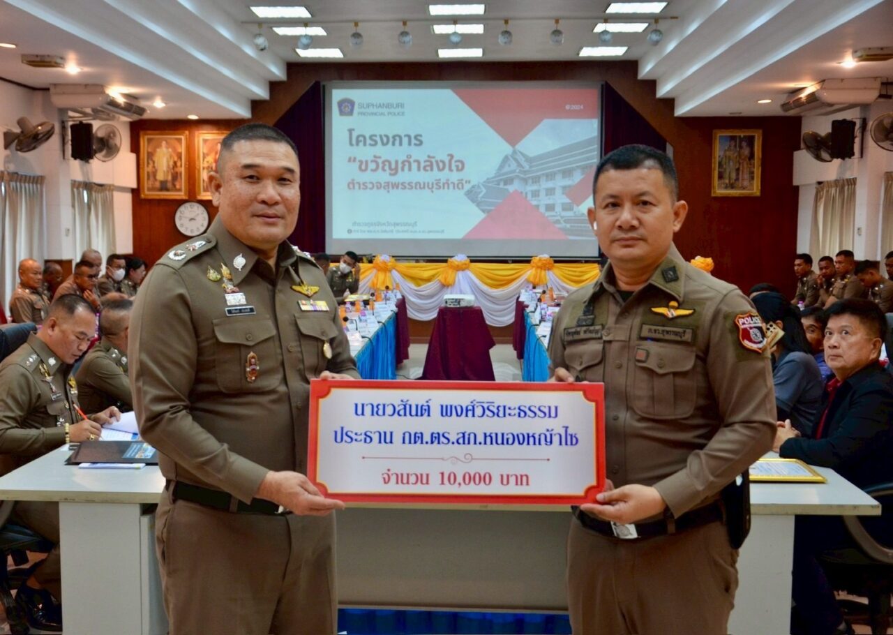 พ.ต.อ.ชัยชาญพัฒน์ ยติรัตนกัญญา ผกก.สภ.หนองหญ้าไซ จ.สุพรรณบุรี เป็นตัวแทน ชลนที มะลิทอง กต.ตร.สภ.หนองหญ้าไซ มอบเงินสนับสนุนโครงการ ขวัญกำลังใจ ตำรวจสุพรรณบุรีทำดี” โดย พล.ต.ต.วัชรินทร์ ประสพดี ผบก.ภ.จว.สุพรรณบุรี เป็นผู้รับมอบ ที่ห้องประชุม ภ.จว.สุพรรณบุรี