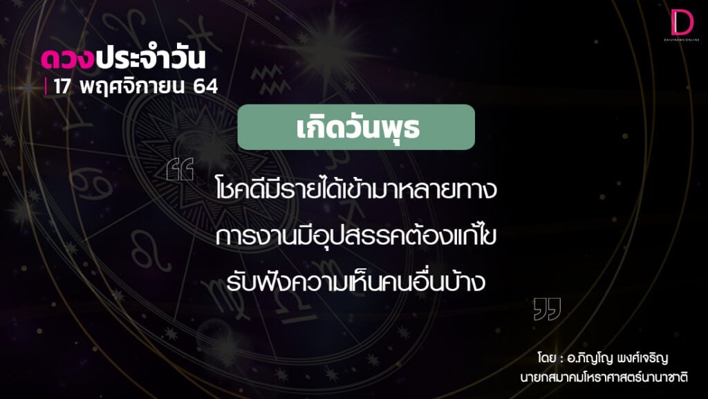วันนี้เวลา 00.00-21.54 น. ดาวจันทร์เสวยอัศวินีนักษัตรฤกษ์ที่ 1 ประกอบด้วยทลิทโทแห่งฤกษ์ ทลิทโท แปลว่า ผู้ขอ ผู้มักน้อย ยากจนเข็ญใจ เวลา 21.55-24.00 น. ดาวจันทร์เสวยภรณีนักษัตรฤกษ์ที่ 2 ประกอบด้วยมหัทธโนแห่งฤกษ์ มหัทธโน แปลว่า คหบดี เศรษฐี ผู้มั่งคั่งด้วยทรัพย์สินเงินทอง วันพุธ-โลกาวินาศตามกาลโยค เวลา 00.00-24.00 น.-ห้ามทำการมงคล ทิศที่เป็นมงคล-ทิศพายัพ (ตะวันตกเฉียงเหนือ) ทิศอัปมงคล-ทิศอาคเนย์ (ตะวันออกเฉียงใต้) สีประจำวัน-สีเขียว สีสิริมงคล-สีม่วงดอกตะแบก สีอัปมงคล-สีชมพู ราศีที่ดาวศรีสถิต-ราศีพฤษภ ราศีที่ดาวกาลีสถิต-ราศีตุล