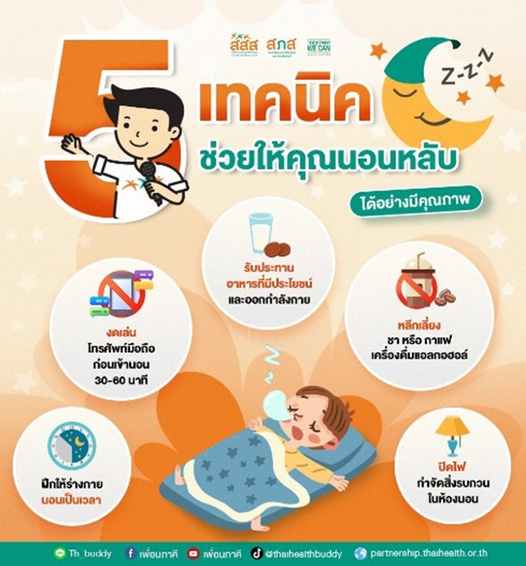 | ควรทำติดต่อกันอย่างน้อยสี่สัปดาห์ ท่านจะหลับสบาย 1. ควรเข้านอนและตื่นนอนให้ตรงเวลาเป็นประจำทุกวัน ทั้งวันทำงานปกติและวันหยุด 2. ห้องนอนควรเงียบสงบ สบาย อุณหภูมิพอเหมาะ ไม่มีเสียง หรือแสงรบกวนขณะหลับ 3. ควรใช้ห้องนอนเพื่อการนอน หรือกิจกรรมทางเพศเท่านั้น 4. หลีกเลี่ยงการงีบหลับตอนกลางวัน 5. หลีกเลี่ยงเครื่องดื่มที่มีส่วนผสมของคาเฟอีน แอลกอฮอล์ และงดสูบบุหรี่อย่างน้อย 4 ชั่วโมงก่อนเข้านอน 6. หลีกเลี่ยงการออกกำลังกายอย่างน้อย 2 ชั่วโมงก่อนเข้านอน 7. หลีกเลี่ยงการรับประทานอาหารมื้อหลักอย่างน้อย 2 ชั่วโมงก่อนเข้านอน 8. หลีกเลี่ยงการมองแสงจ้า เช่น การเล่นสมาร์ทโฟน หรือแท็บเล็ต ก่อนเข้านอน 9. หลีกเลี่ยงการมีอารมณ์ขุ่นเคือง ตื่นเต้นสนุกสนาน หวาดกลัว เช่น การโต้เถียง การดูภาพยนตร์ตื่นเต้นสยองขวัญก่อนเข้านอน 10. การผ่อนคลายลดความวิตกกังวล ช่วยให้การนอนหลับง่ายขึ้น 11. หากนอนไม่หลับภายในเวลาประมาณ 20 นาที ไม่ควรพยายามมองหาว่าขณะนี้เป็นเวลาเท่าไร ควรลุกจากที่นอนเพื่อทำกิจกรรมอื่น ๆ นอกจากนอน เช่น นั่งอ่านหนังสือ ฟังเพลง หรือสวดมนต์ แล้วกลับมาที่เตียงนอนอีกครั้งเมื่อเริ่มง่วงเท่านั้น 12. รับแสงแดดให้เพียงพอในตอนเช้าอย่างน้อยวันละ 30 นาที เนื่องจากแสงแดดเป็นตัวควบคุมนาฬิกาชีวิตที่สำคัญ |