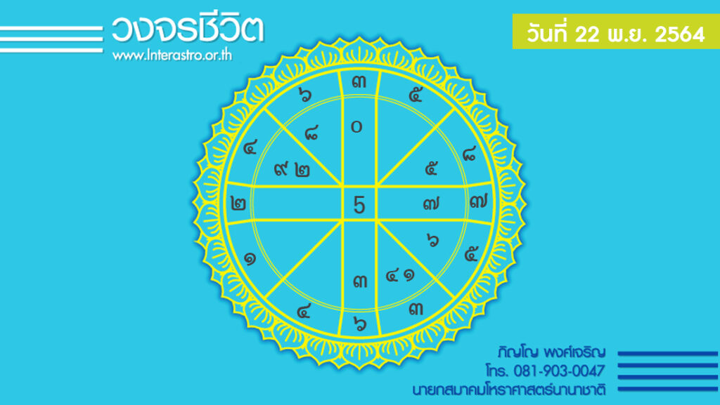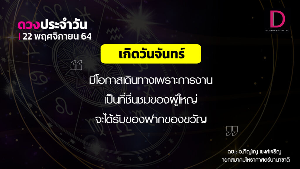 สุริยคติกาล วันที่ 22 พฤศจิกายน พ.ศ. 2564 ค.ศ. 2021 จันทรคติกาล ตรงกับวันจันทร์ แรม 3 ค่ำ เดือน 12 ปีฉลู ตรีศก จุลศักราช 1383 อาทิตย์อุทัย เวลา 06.21 น. เที่ยงจริง เวลา 12.04 น. อาทิตย์ตก เวลา17.47 น. จันทร์ขึ้น เวลา 20.44 น.