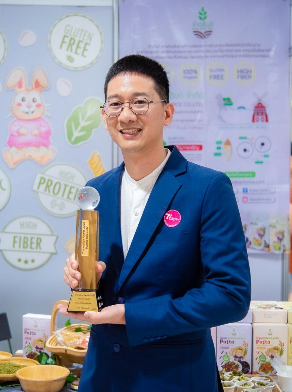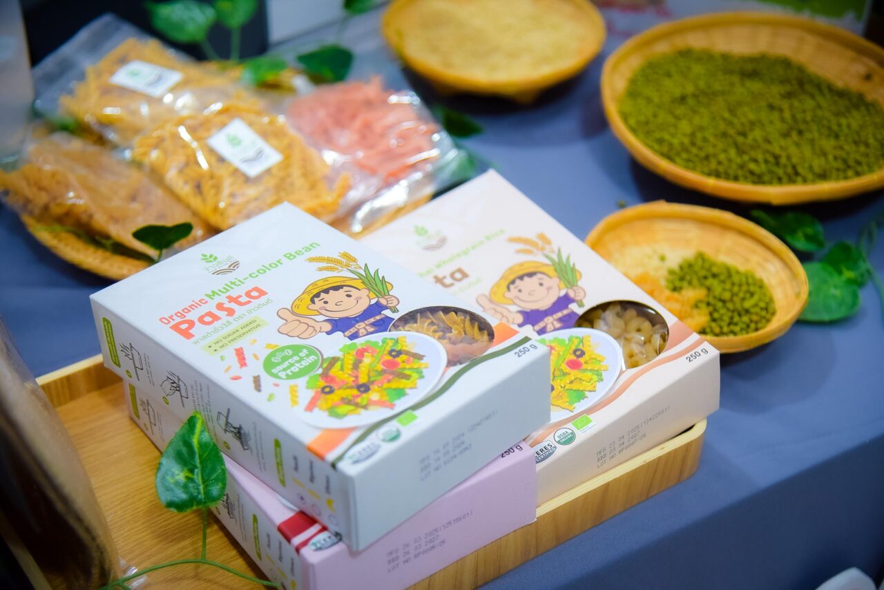 สำหรับกรณีศึกษาแรกเป็น “พาสต้าถั่วเขียวออร์แกนิค” ของ วัชรากร กิจตรงศิริ ผู้ก่อตั้งบริษัท ข้าวดินดี จำกัดที่ใช้นวัตกรรมมายกระดับถั่วพื้นบ้านให้กลายเป็นซูเปอร์ฟู้ดระดับโลก โดยหวังช่วยยกระดับรายได้ให้เกษตรกรในบ้านเกิด โดยช่วงแรกเขาได้เริ่มด้วยการทำพาสต้าจากข้าว จากนั้นจึงพัฒนามาเป็นพาสต้าถั่วเขียวออร์แกนิค เพราะมองว่าถั่วเขียวจะช่วยแก้ปัญหาได้ โดยทำงานร่วมกับ สวทช. เริ่มจากนำถั่วเขียวสายพันธุ์ KUML ที่เกิดจากการวิจัยร่วมกันกับมหาวิทยาลัยเกษตรศาสตร์ ซึ่งมีจุดเด่นที่สุกพร้อมกัน เก็บเกี่ยวสะดวก และทนแล้งได้ดี นำไปให้เกษตรกรปลูก โดยบริษัทจะรับซื้อถั่วเขียวจากเกษตรกร โดยแต่ละปีรับซื้อมากถึง 20-30 ตัน ส่งผลให้มีรายได้ต่อปีมากกว่า 6 ล้านบาทกลับคืนสู่ชุมชน ทั้งนี้ ผู้ประกอบการคนเดิมเล่าว่าถั่วเขียวที่รับซื้อจะถูกนำไปแปรรูปเป็นสินค้า 8 รายการ โดยสินค้าส่วนใหญ่ส่งออกไปตลาดใหญ่ในต่างประเทศ เช่น สหรัฐอเมริกา แคนาดา อังกฤษ แต่ขณะนี้ก็กำลังเตรียมขยายตลาดในไทยเพิ่ม เพื่อให้ผลผลิตเกษตรกรภาคอีสานถึงมือคนไทยมากขึ้น ผู้ประกอบการคนเดิมกล่าว และจากแนวคิดก้าวข้ามกำไรสู่การพัฒนาแบบ win-win เช่นนี้ ส่งผลให้สินค้านวัตกรรมนี้ คว้ารางวัลชนะเลิศสุดยอดนวัตกรรมเพื่อสังคมจากเวที 7 Innovation Awards 2025ในปีนี้ไปครองได้สำเร็จ