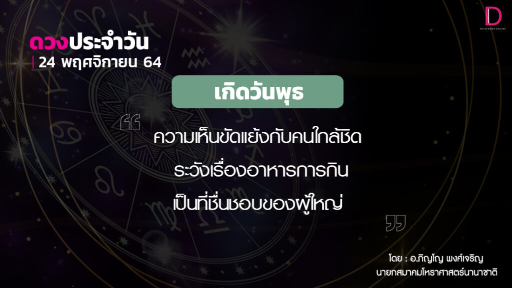 วันนี้ เวลา 00.00-12.18 น. ดาวจันทร์เสวยปุนนัพสุนักษัตรฤกษ์ที่ 7 ประกอบด้วยเพชฌฆาตแห่งฤกษ์ เพชฌฆาต แปลว่า ผู้ฆ่า ทำการเพื่อให้สิ่งที่เข้ามาพ่ายแพ้ เวลา 12.19-24.00 น. ดาวจันทร์เสวยปุษยะนักษัตรฤกษ์ที่ 8 ประกอบด้วยราชาแห่งฤกษ์ ราชา แปลว่า พระเจ้าแผ่นดิน วันพุธ-โลกาวินาศตามกาลโยค เวลา 00.00-06.22 น.-ทำการมงคลได้ตามฤกษ์บนหมวดเพชฌฆาตฤกษ์ เวลา 06.23-24.00 น.-ห้ามทำการมงคล ทิศที่เป็นมงคล-ทิศพายัพ (ตะวันตกเฉียงเหนือ) ทิศอัปมงคล-ทิศอาคเนย์ (ตะวันออกเฉียงใต้) สีประจำวัน-สีเขียว สีสิริมงคล-สีม่วงดอกตะแบก สีอัปมงคล-สีชมพู ราศีที่ดาวศรีสถิต-ราศีพฤษภ ราศีที่ดาวกาลีสถิต-ราศีตุล