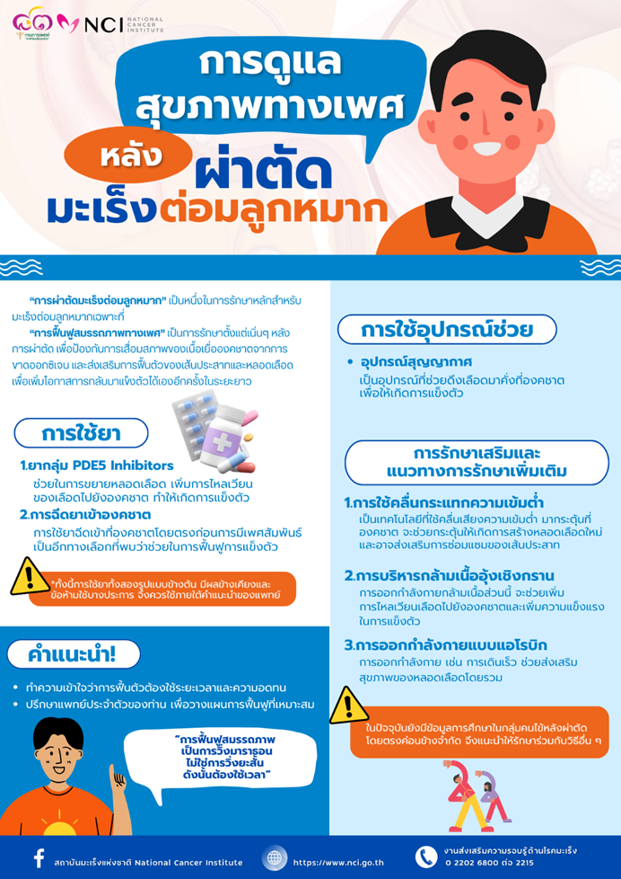 บทสรุปและคำแนะนำ การฟื้นฟูสมรรถภาพทางเพศหลังการผ่าตัดมะเร็งต่อมลูกหมากเป็น “การวิ่งมาราธอน ไม่ใช่การวิ่งระยะสั้น” การฟื้นตัวของเส้นประสาทอาจใช้เวลาตั้งแต่ 1-2 ปี หรือนานถึง 4 ปี สิ่งสำคัญคือ ทำความเข้าใจว่าการฟื้นตัวต้องใช้ระยะเวลาและความอดทน และปรึกษาแพทย์ประจำตัวของท่าน เพื่อวางแผนการฟื้นฟูที่เหมาะสมและหากมีอาการผิดปกติให้รีบปรึกษาแพทย์โดยเร็ว หากท่านมีข้อสงสัย สามารถศึกษาเพิ่มเติมได้จากสถาบันมะเร็งแห่งชาติผ่านทาง Facebook : สถาบันมะเร็งแห่งชาติ National Cancer Institute และ LINE : NCI รู้สู้มะเร็ง