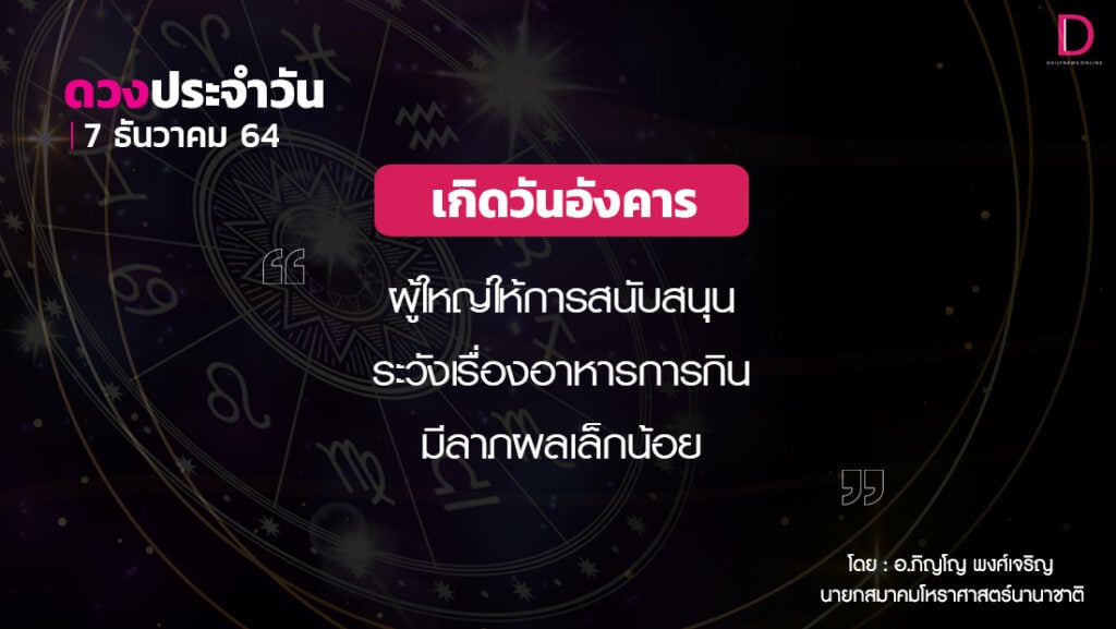 สุริยคติกาล วันที่ 7 ธันวาคม พ.ศ. 2564 ค.ศ. 2021จันทรคติกาล ตรงกับวันอังคาร ขึ้น 3 ค่ำ เดือน 1 ปีฉลู ตรีศก จุลศักราช 1383 อาทิตย์ขึ้น เวลา 06.29 น. เที่ยงจริง เวลา 12.10 น.อาทิตย์ตก เวลา 17.49 น.จันทร์ตก เวลา 21.09 น.