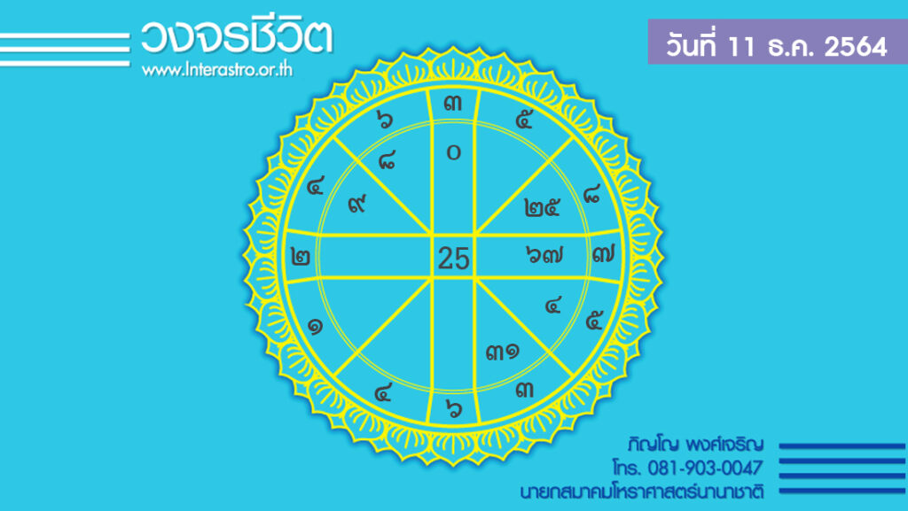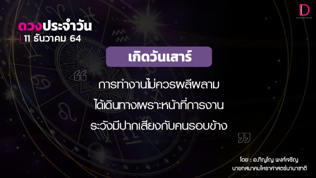 วันนี้ เวลา 00.00-02.42 น. ดาวจันทร์เสวยศตภิสัชนักษัตรฤกษ์ที่ 24 ประกอบด้วยเทวีแห่งฤกษ์ เทวี แปลว่า นางพญา เวลา 02.43-24.00 น. ดาวจันทร์เสวยปุรพภัทรบทนักษัตรฤกษ์ที่ 25 ประกอบด้วยเพชฌฆาตแห่งฤกษ์ เพชฌฆาต แปลว่า ผู้ฆ่า ทำการเพื่อให้สิ่งที่เข้ามาพ่ายแพ้ วันเสาร์-อุบาทว์ตามกาลโยค เวลา 00.00-24.00 น.-ห้ามทำการมงคล ทิศที่เป็นมงคล-อุดร (เหนือ) ทิศอัปมงคล-ทักษิณ (ใต้) สีประจำวัน-ดำ สีสิริมงคล-ฟ้า น้ำเงิน สีอัปมงคล-เขียวสด ราศีที่ดาวศรีสถิต-มังกร ราศีที่ดาวกาลีสถิต-ธนู