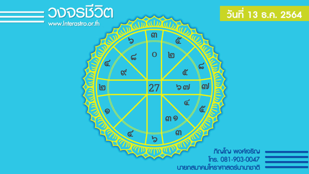 สุริยคติกาลวันที่ 13 ธันวาคม พ.ศ. 2564 ค.ศ. 2021จันทรคติกาล ตรงกับวันจันทร์ ขึ้น 9 ค่ำ เดือน 1 ปีฉลู ตรีศก จุลศักราช 1383 อาทิตย์อุทัย เวลา 06.32 น. เที่ยงจริง เวลา 12.12 น. อาทิตย์ตก เวลา 17.51 น. จันทร์ตก เวลา 02.09 น.