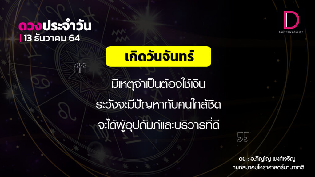 วันนี้ เวลา 00.00-03.54 น. ดาวจันทร์เสวยอุตรภัทรบทนักษัตรฤกษ์ที่ 26 ประกอบด้วยราชาแห่งฤกษ์ ราชา แปลว่า พระเจ้าแผ่นดิน เวลา 03.55-24.00 น. ดาวจันทร์เสวยเรวดีนักษัตรฤกษ์ที่ 27 ประกอบด้วยสมโณแห่งฤกษ์ สมโณ แปลว่า ผู้สงบ วันจันทร์-อธิบดีตามกาลโยค เวลา 00.00-24.00 น.-ห้ามทำการมงคล ทิศที่เป็นมงคล-ทิศหรดี (ตะวันตกเฉียงใต้) ทิศอัปมงคล-ทิศอีสาน(ตะวันออกเฉียงเหนือ) สีประจำวัน-สีขาว สีสิริมงคล-สีดำ ม่วงแก่ เทา สีอัปมงคล-สีแดง แดงส้ม ราศีที่ดาวศรีสถิต-ราศีมังกร ราศีที่ดาวกาลีสถิต-ราศีพิจิก