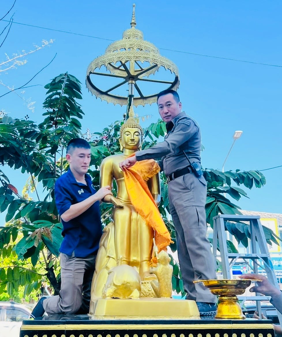 พ.ต.อ.บุญย์พัชร์ ปิยะบุญสิทธิ ผกก.สภ.เมืองสุพรรณบุรี นำข้าราชการตำรวจ ในสังกัดไหว้สักการะหลวงพ่อโตวัดป่าเลไลยก์ สิ่งศักดิ์สิทธิ์ประจำสถานี และถวายเครื่องห่มผ้าพระพุทธรูป เพื่อแสดงความศรัทธาเป็นธรรมเนียมปฏิบัติ และเพื่อความเป็นสิริมงคลเสริมสร้างขวัญกำลังใจในการปฏิบัติหน้าที่ ในวาระครบรอบ 2 ปี ในการจัดสร้าง ที่หน้า สภ.เมืองสุพรรณบุรี