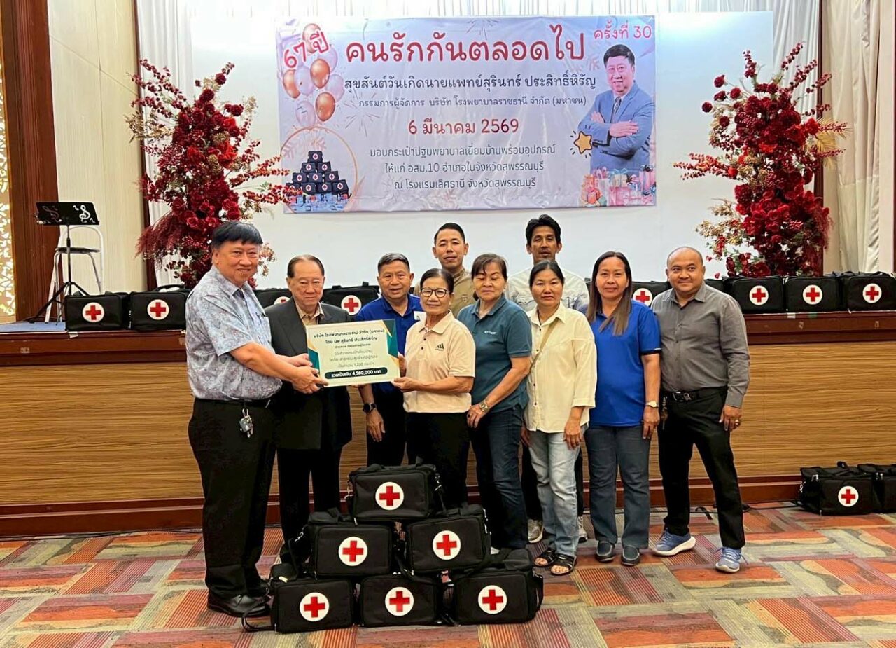 มอบกระเป๋า… นพ.สุรินทร์ ประสิทธิหิรัญ กรรมการผู้จัดการ บริษัท โรงพยาบาลราชธานี จำกัด (มหาชน) มอบกระเป๋าปฐมพยาบาล ให้กับ อาสาสมัครสาธารณสุขประจำหมู่บ้าน ใน จ.สุพรรณบุรี จำนวน 7,350 ใบ จำนวนเงิน 27,930,000 บาท ที่โรงแรมเลิศธานี จ.สุพรรณบุรี โดยมี จองชัย เที่ยงธรรม อดีต รมช.แรงงาน ,สมศักดิ์ ปริศนานันทกุล อดีต รองประธานสภาผู้แทนราษฎร ดีต รมว.เกษตรฯ และอดีต รมว.ศึกษาธิการ ที่โรงแรมเลิศธานี จ.สุพรรณบุรี (ศูนย์ข่าวเดลินิวส์ภาคตะวันตก จ.สุพรรณบุรี)