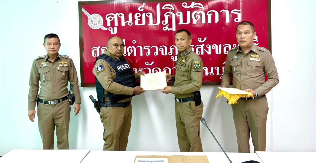 ประกาศนียบัตร…. พล.ต.ต.พศวีร์ เรืองภู่ ผบก.ภ.จว.กาญจนบุรี เดินทางมาตรวจราชการชายแดนด่านเจดีย์สามองค์ อ.สังขละบุรี จ.กาญจนบุรี พร้อมมอบใบประกาศนียบัตรคุณงามความดีของเจ้าหน้าที่หน่วยงานความมั่นคง ที่ร่วมกันจับกุมแก๊งคอลเซ็นเตอร์ (จีน) ยึดของกลางยาเสพติดมูลค่าหลายล้านบาท โดยมี พ.ต.อ.สันติ พิทักษ์สกุล ผกก.สังขละบุรี ให้การต้อนรับและนำตรวจราชการชายแดน (จิตรภานุ ทองผาภูมิพรทวี จ.กาญจนบุรี)