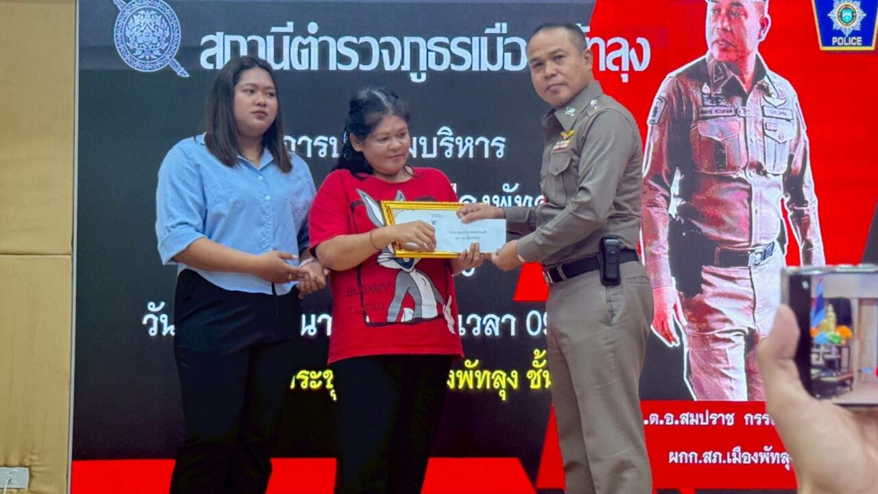 เชิดชูความซื่อสัตย์. พ.ต.อ.สมปราช กรรณกานนท์ ผกก.สภ.เมืองพัทลุง มอบประกาศเกียรติคุณพร้อมรางวัลให้แก่ อุษา สีขาว และ .สิริขวัญ บุญรุ่ง เพื่อเชิดชูความซื่อสัตย์สุจริต หลังทั้งสองพบเงินสดจำนวน 100,024 บาท เมื่อวันที่ 8 มีนาคมที่ผ่านมา และนำส่งเจ้าหน้าที่เพื่อติดตามคืนให้เจ้าของ ณ สภ,เมืองพัทลุง
