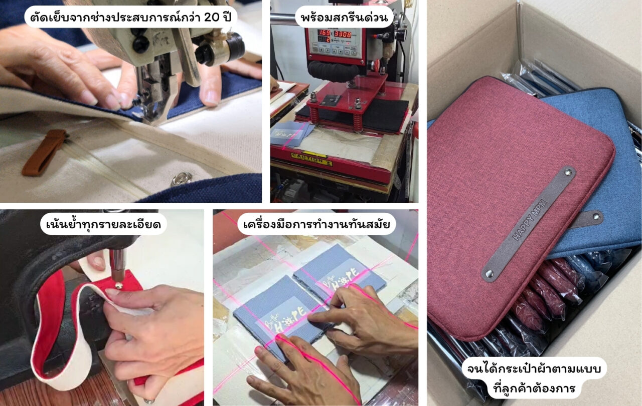 ฝ่ายผลิต : ดูแลกระบวนการผลิต ตั้งแต่การตัดผ้า การสกรีนลาย ไปจนถึงการเย็บประกอบกระเป๋าให้ได้ตามมาตรฐาน โดยผู้เชี่ยวชาญการทำกระเป๋าผ้าที่มีประสบการณ์กว่า 20 ปี