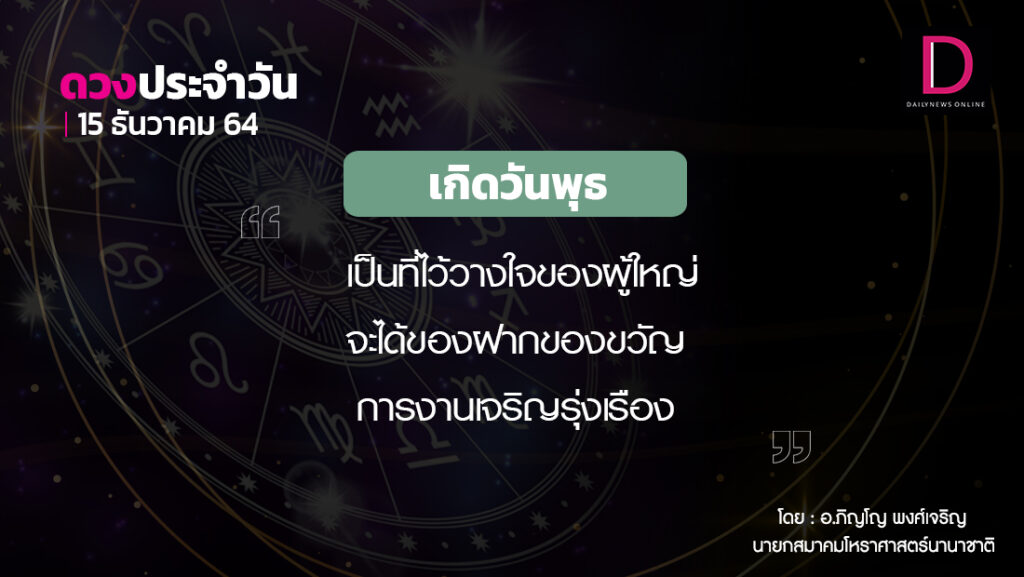 วันนี้ เวลา 00.00-06.18 น. ดาวจันทร์เสวยอัศวินีนักษัตรฤกษ์ที่ 1 ประกอบด้วยทลิทโทแห่งฤกษ์ ทลิทโท แปลว่า ผู้ขอ ผู้มักน้อย เวลา 06.19-24.00 น. ดาวจันทร์เสวยภรณีนักษัตรฤกษ์ที่ 2 ประกอบด้วยมหัทธโนแห่งฤกษ์ มหัทธโน แปลว่า คหบดี เศรษฐี ผู้มั่งคั่งด้วยทรัพย์สินเงินทอง วันพุธ-โลกาวินาศตามกาลโยค เวลา 00.00-06.18 น.-ทำการมงคลได้ตามฤกษ์บนหมวดทลิทโทฤกษ์ เวลา 06.19-23.56 น.-ทำการมงคลได้สารพัดตามฤกษ์บนหมวดมหัทธโนฤกษ์ เวลา 23.57-24.00 น.-ห้ามทำการมงคล ทิศที่เป็นมงคล-พายัพ(ตะวันตกเฉียงเหนือ) ทิศอัปมงคล-อาคเนย์(ตะวันออกเฉียงใต้) สีประจำวัน-เขียว สีสิริมงคล-ม่วงดอกตะแบก สีอัปมงคล-ชมพู ราศีที่ดาวศรีสถิต-พฤษภ ราศีที่ดาวกาลีสถิต-พิจิก