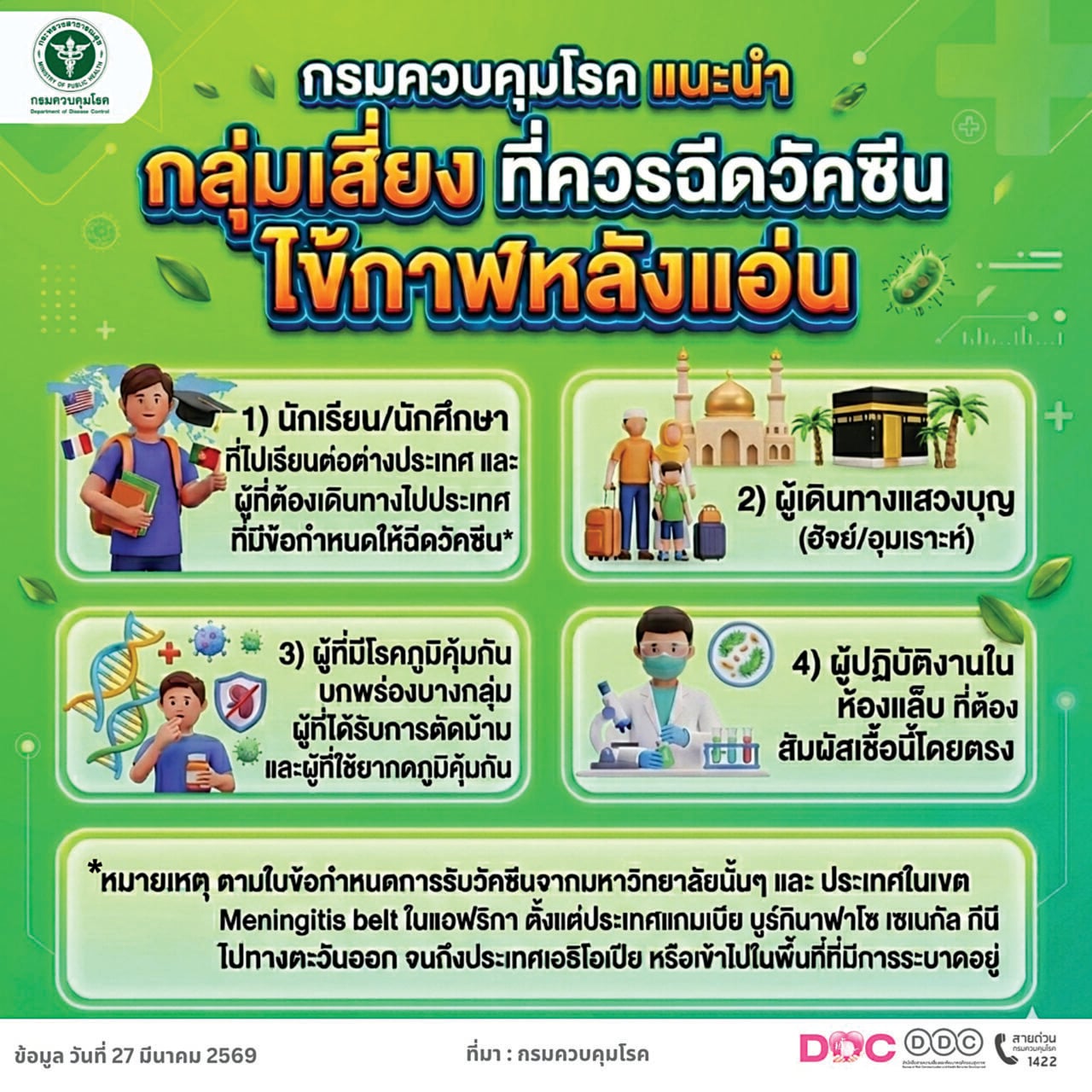 สำหรับประเทศไทย ไม่ใช่โรคใหม่ โดยข้อมูล 10 ปีย้อนหลัง เราพบไข้กาฬหลังแอ่นทุกปีประมาณ 20 คนต่อปี โดยปี 2568 มีผู้ป่วยมากขึ้นอยู่ที่ 39 ราย ที่ต้องระวังคือ เมื่อรับเชื้อแล้วจะเสียชีวิตเร็วภายใน 24-48 ชั่วโมง แม้ได้รับการรักษา โดยเฉพาะรับยาปฏิชีวนะช้า โดยข้อมูลตั้งแต่วันที่ 1 ม.ค.-17 มี.ค.2569 มีผู้ป่วยสะสม 5 ราย มีผู้เสียชีวิต 3 ราย อัตราป่วยตายร้อยละ 60 ไม่พบรายงานการระบาดเป็นกลุ่มก้อน กลุ่มผู้ป่วยพบมากอยู่ที่อายุ 0-4 ปี,40-49 ปี และ 20-29 ปีตามลำดับ