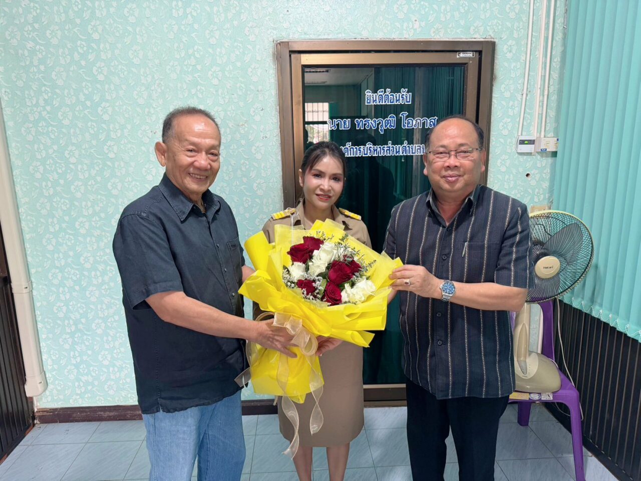 แสดงความยินดี… ทรงพล ทิมาศาสตร์ อดีต ผวจ.สุพรรณบุรี และ ทรงวุฒิ โอภาส นายก อบต.บางใหญ่ อ.บางปลาม้า จ.สุพรรณบุรี แสดงความยินดี กับ เมธีรา ฟักอินทร์ ในโอกาสย้ายไปเป็น รองปลัด อบต.บางใหญ่ (ศูนย์ข่าวเดลินิวส์ภาคตะวันตก จ.สุพรรณบุรี)