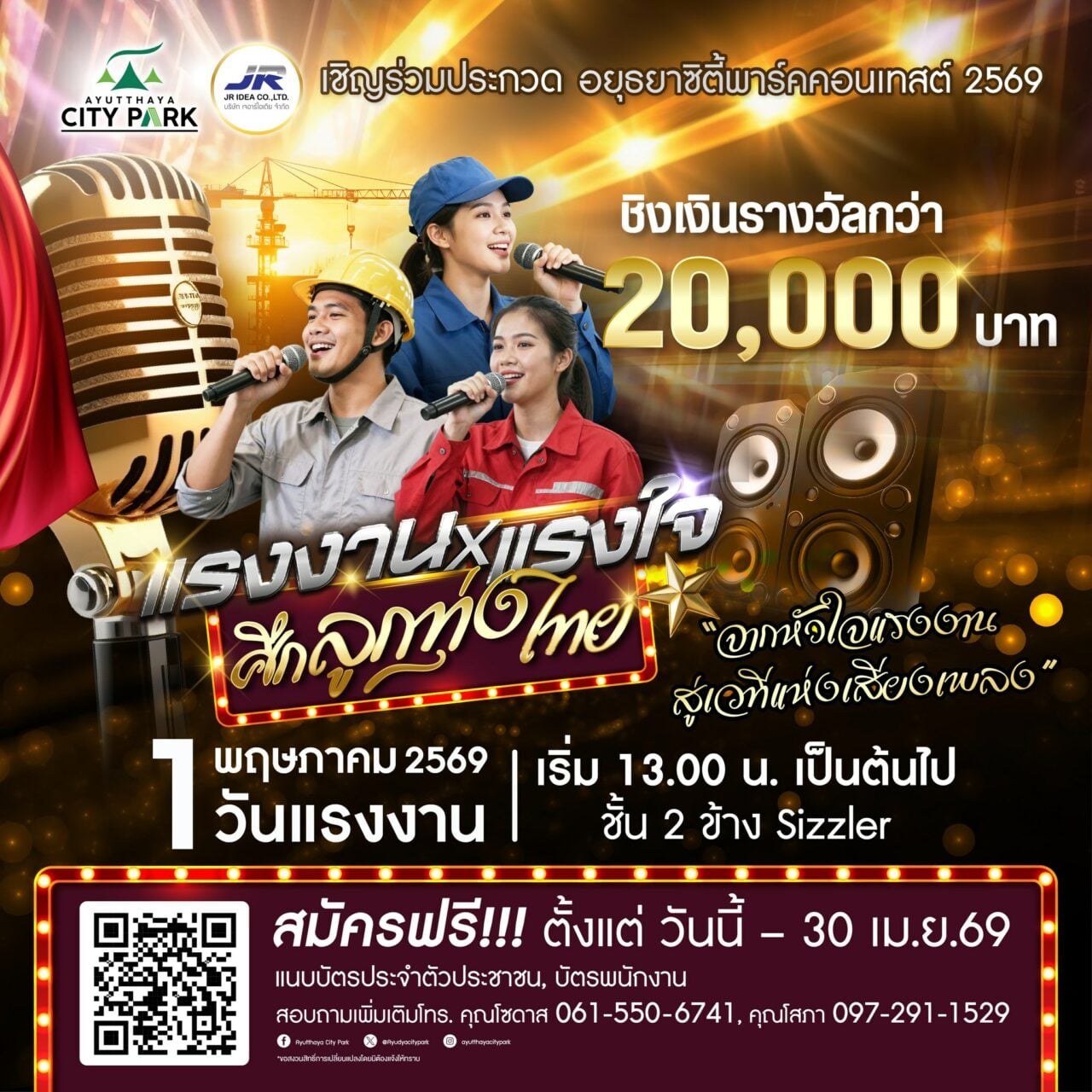 ไฮไลท์พิเศษ.. พบกับแขกรับเชิญ “น้องเพลง ฐิติชญา” จากรายการชิงช้าสวรรค์ ที่จะมาร่วมสร้างสีสันภายในงาน เริ่มการแข่งขันตั้งแต่เวลา 13.00 น. เป็นต้นไป ที่ชั้น 2 บริเวณหน้าโรบินสัน (ข้าง Sizzler) คุณสมบัติ: เป็นผู้ใช้แรงงาน หนุ่มสาวโรงงาน / พนักงานบริษัท/ห้างร้าน / พ่อค้าแม่ค้า ที่มีใจรักเพลงลูกทุ่ง, ประเภทบุคคล (ไม่แยกชาย-หญิง), ไม่จำกัดเพศ, อายุตั้งแต่ 18 ปี ขึ้นไป, มีสัญชาติไทยสามารถสมัครผ่านระบบออนไลน์ได้ที่ แบบฟอร์มการสมัคร (Google Form) โดยสแกนผ่าน QR Code ที่ขึ้นอยู่บนสื่อโฆษณานี้ พร้อมแนบบัตรประชาชน หรือบัตรพนักงาน **กรณีไม่มีบัตรพนักงานให้ถ่ายภาพขณะทำงาน ส่งมาแทนได้