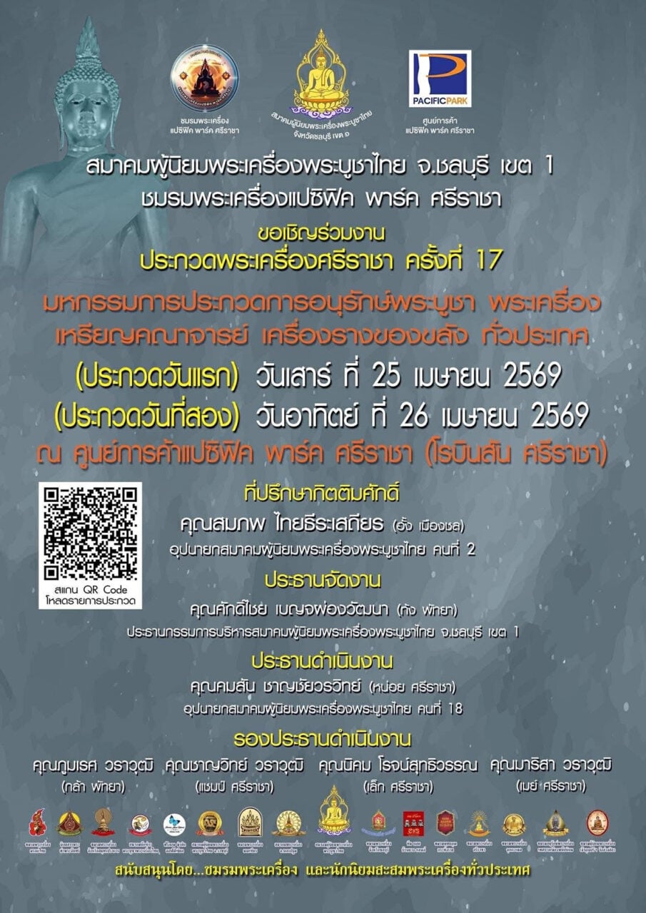 ขอเชิญร่วมงานประกวดพระเครื่องศรีราชา ครั้งที่ 17 ในวันที่ 25-26 เมษายน 2569 ณ ห้างโรบินสัน ศรีราชา คุณคมสัน ชาญชัยวรวิทย์ อุปนายกสมาคมผู้นิยมพระเครื่องพระบูชาไทย ประธานดำเนินงาน พ.ต.อ.พรชัย อมรสวัสดิ์ศิริ รองประธานบริหารสมาคมผู้นิยมพระเครื่องพระบูชาไทย สาขาจังหวัดชลบุรี เขต 1 ฝากประชาสัมพันธ์มา