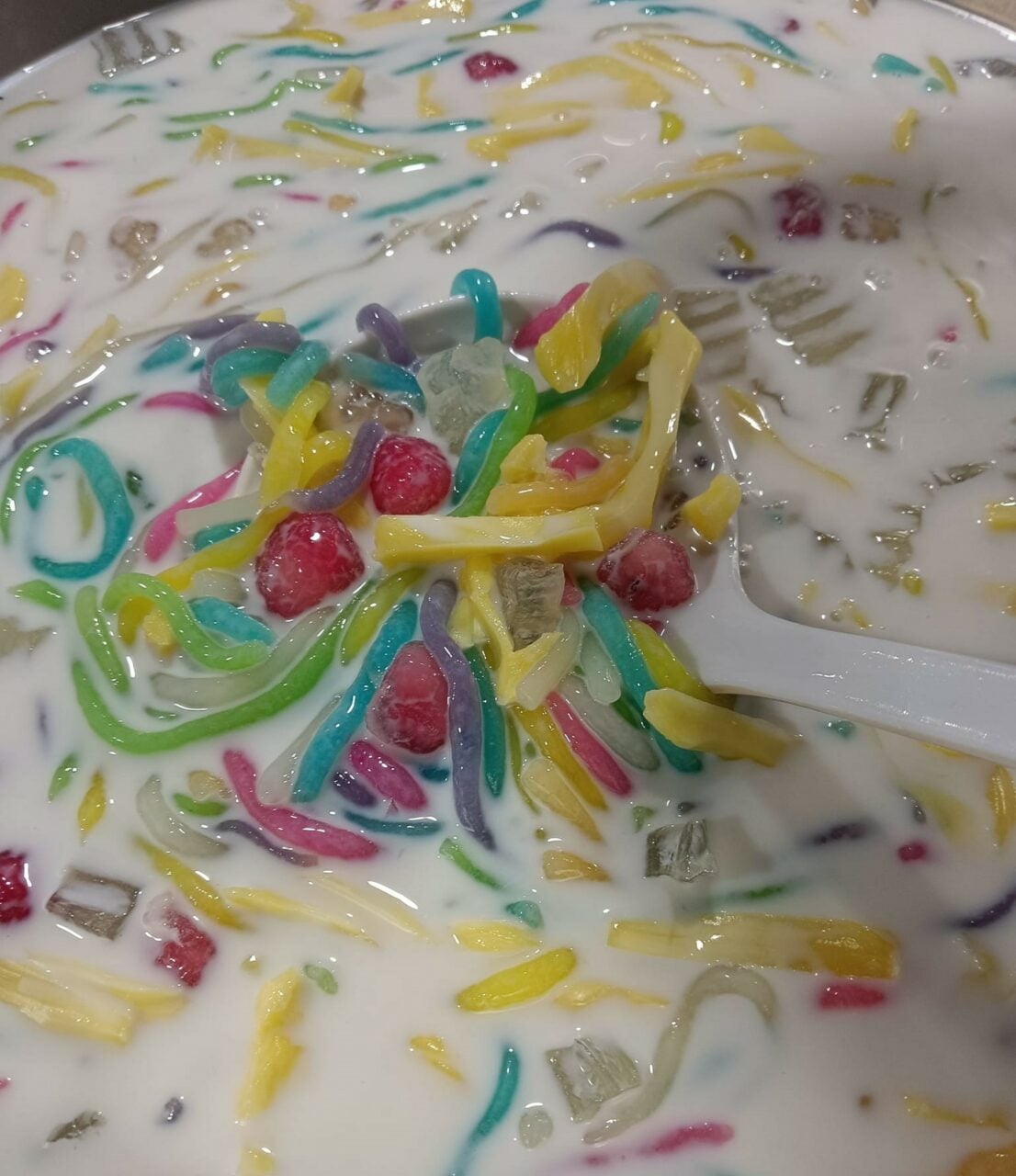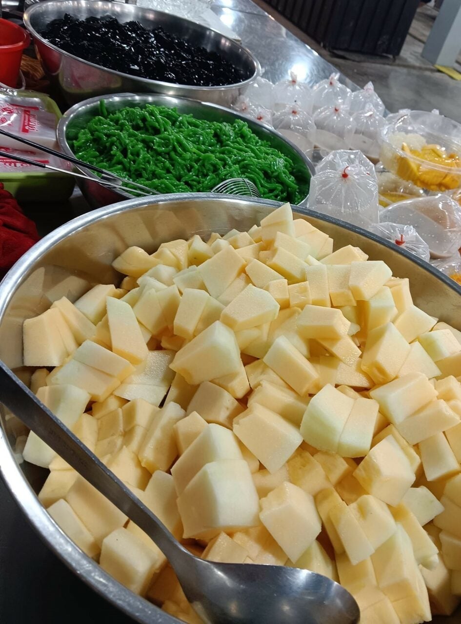 พอถึงเวลาจะทาน ก็ตักรวมมิตรใส่ถ้วย ตามด้วยน้ำเชื่อมใบเตยปริมาณมากน้อยเท่าความหวานที่ชอบ ตามด้วยน้ำแข็งป่นไม่ต้องมาก อาจจะโรยด้วยขนุนฉีกอีกสักหน่อย เพียงเท่านี้ก็อร่อยชื่นใจแล้ว