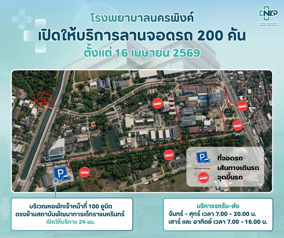 โรงพยาบาลนครพิงค์เชียงใหม่ (ป่าแงะ) เปิดลานจอดรถ 200 คัน อำนวยสะดวกสบายให้กับผู้ที่มาใช้บริการมายิ่งขึ้น….โรงพยาบาลนครพิงค์ หรือที่คนเหนือคนเชียงใหม่ รู้จักและเรียกกันติดปากว่า โรงพยาบาล ป่าแงะ เปิดให้บริการลานจอดรถจำนวน 200 คัน ตั้งแต่ 16 เมษายน 2569 เป็นต้นมา ณ บริเวณหอพักเจ้าหน้าที่ 100 ยูนิต ตรงข้ามสถาบันพัฒนาการเด็กราชนครินทร์ โดย เปิดให้บริการตลอด 24 ชั่วโมง มีรถบรการรับ-ส่ง จากลานจอดรถถึงโรงพยาบาล ในวันจันทร์ – วันศุกร์ ตั้งแต่เวลา 7.00 – 20.00 น. ส่วนวันเสาร์ และ วันอาทิตย์ให้บริการตั้งแต่ เวลา 7.00 – 16.00 น. ….